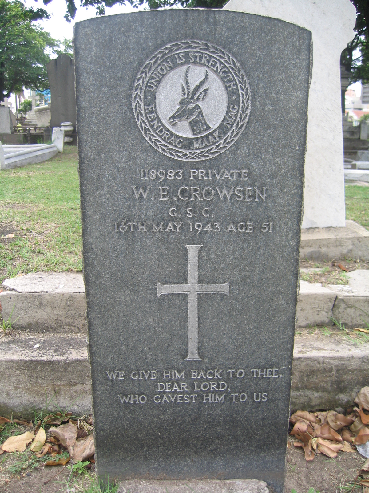 Son of John Thomas and Jessie Hume (nee Armstrong) Crowsen; husband of Natalie Blanche Ellen (nee Harman) Crowsen, of Durban.