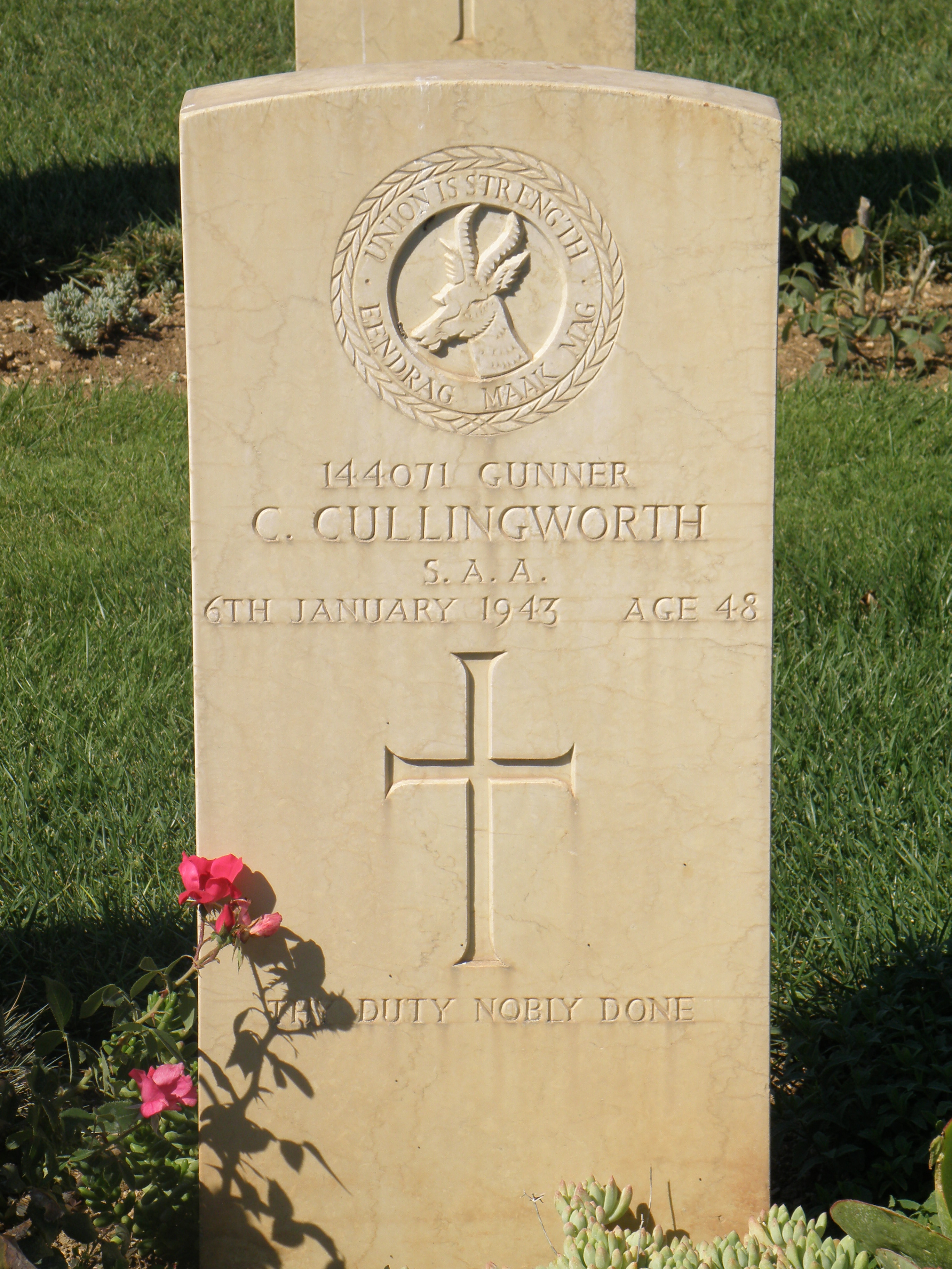 Son of Alfred William and Harriet Matilda Cullingworth; husband of Elva Chester Cullingworth, of Pietermaritzburg, Natal, South Africa. A poultry farmer