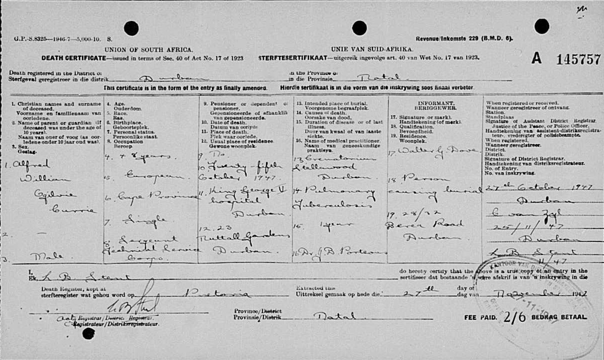 Son of Murdoch and Ada Selena Currie. Born East London. A salesman clerk. Commemoration stone in East London (West Bank) Cemetery. His brother died in service in WW1
