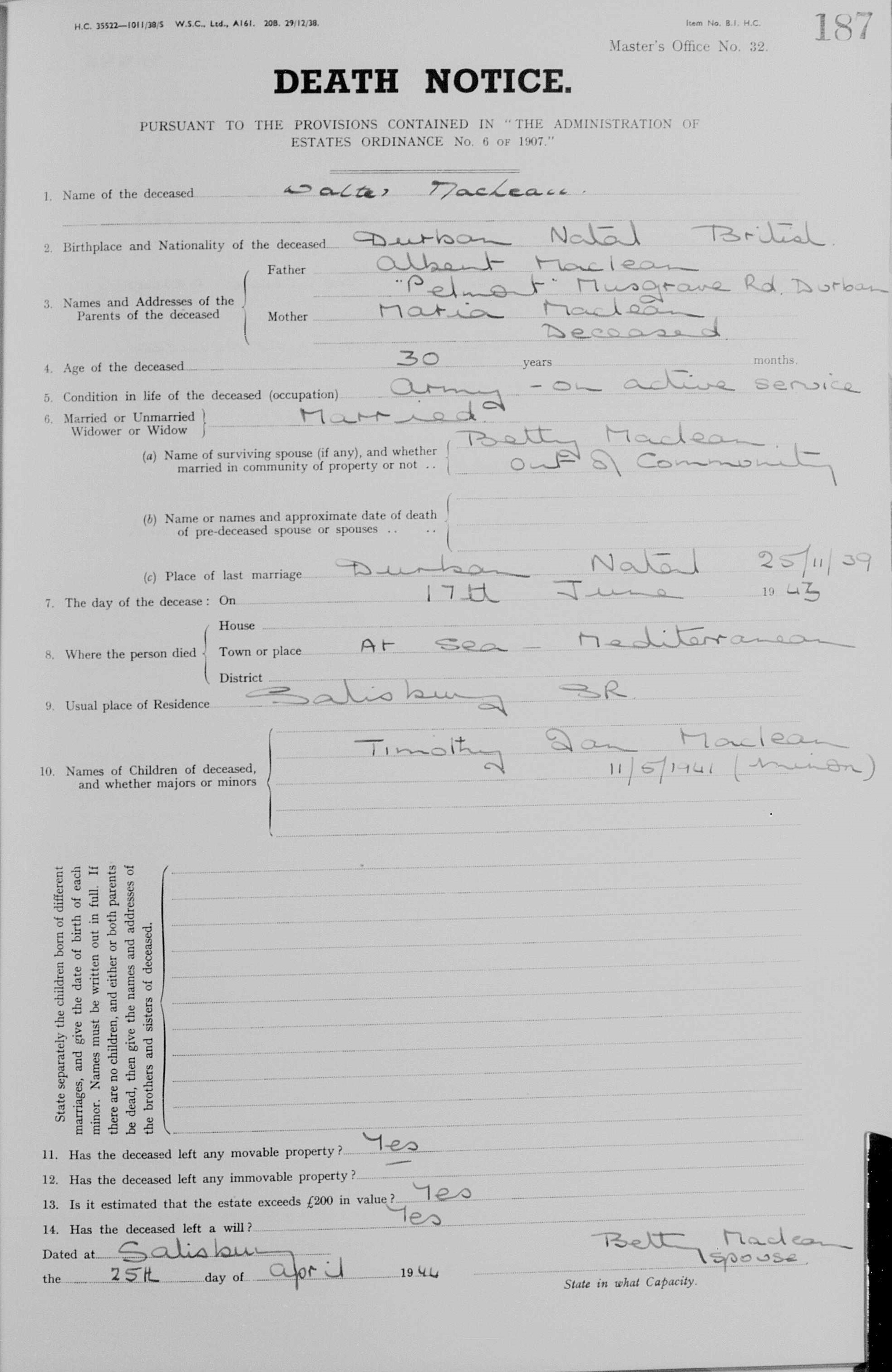 Son of Albert and Matia McLean, of "Pelmont" Musgrave Road, Durban, South Africa. Husband of Betty MacLean. |