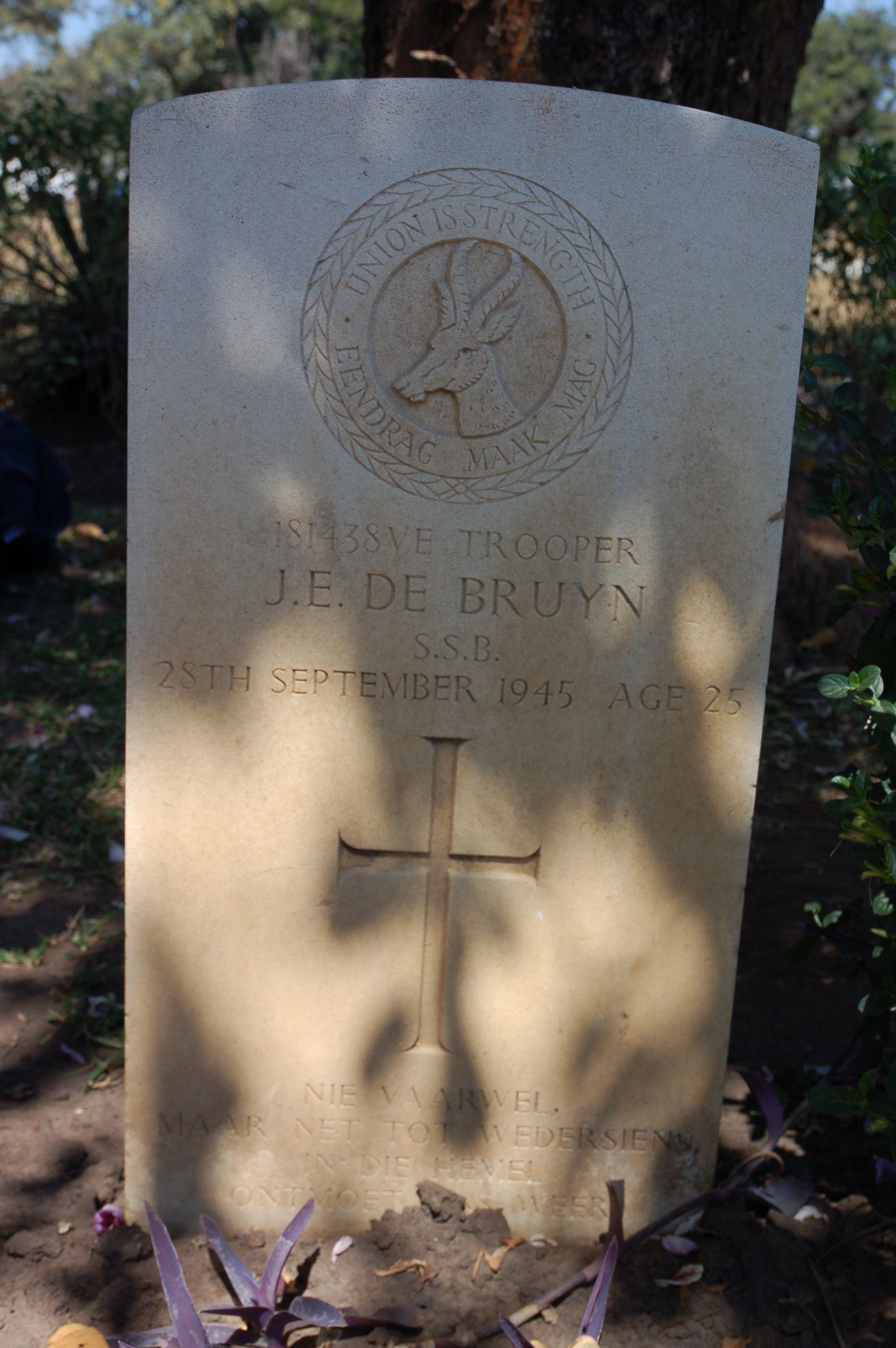 Son of Johannes David Hendrik De Bruin and Hester Jacoba Steyn, (formerly De Bruyn nee De Wet), of Campbell's Hope, P.O. Sunbeam, Kroonstad, Orange Free State. Born Grootkuil Dist, Vredefort, Transvaal. He was unmarried.