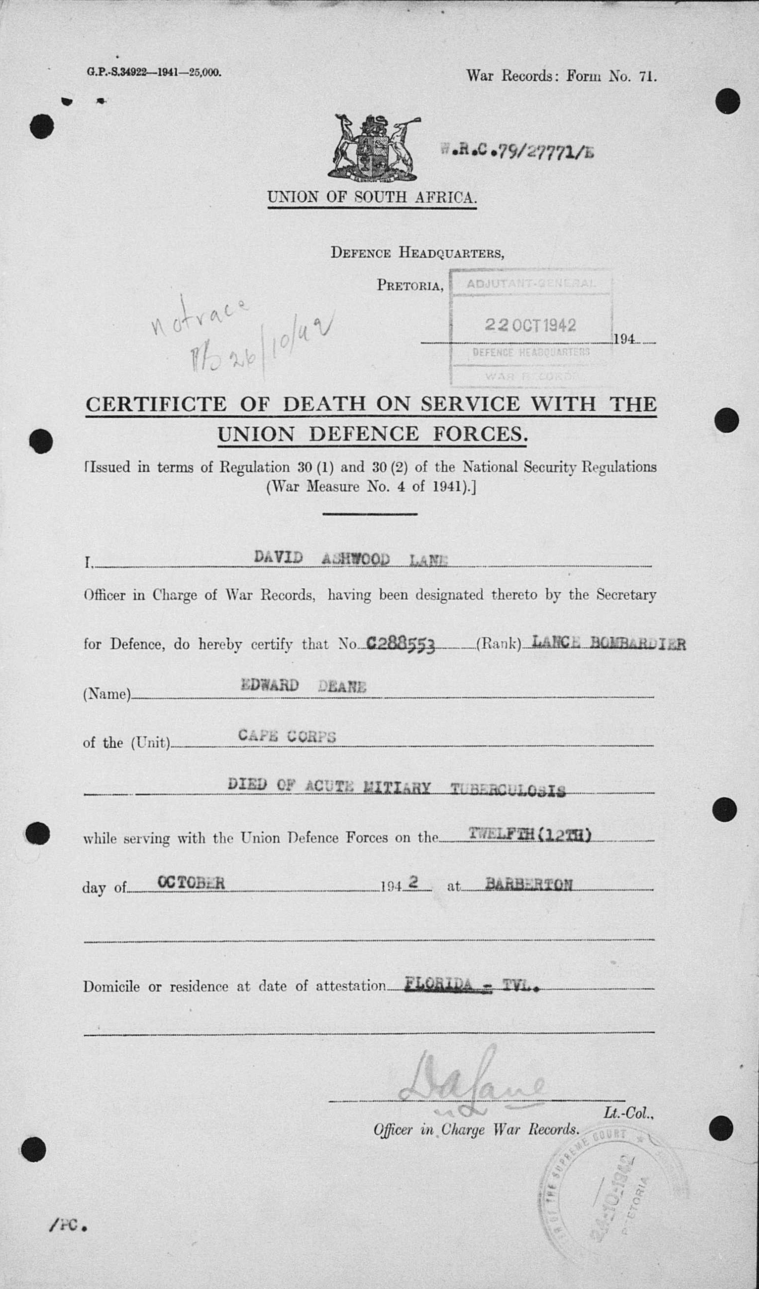 Son of Albert E. and Ellen Deane, of 17 Subway Avenue, Florida, Transvaal. A motor driver. |