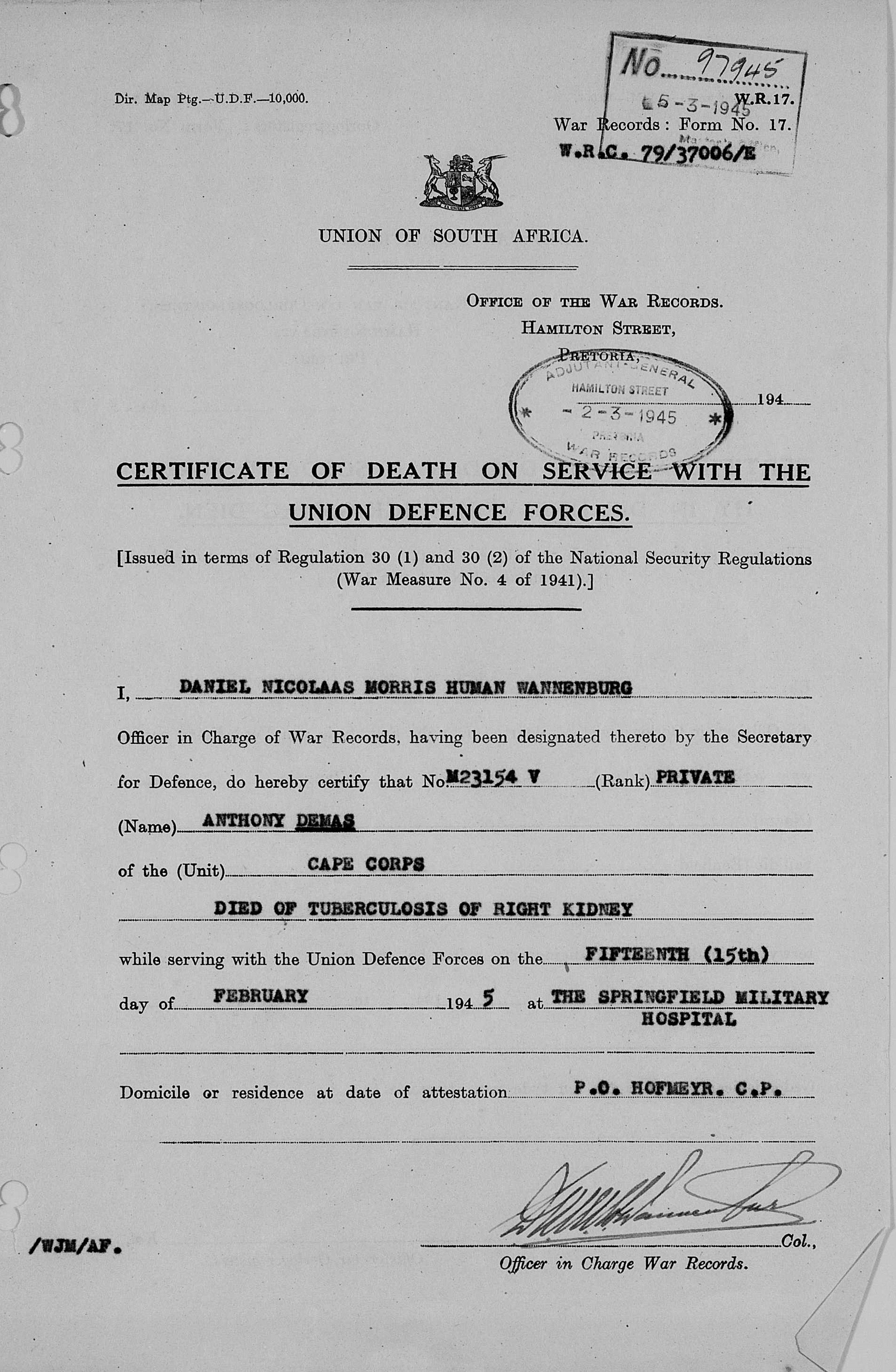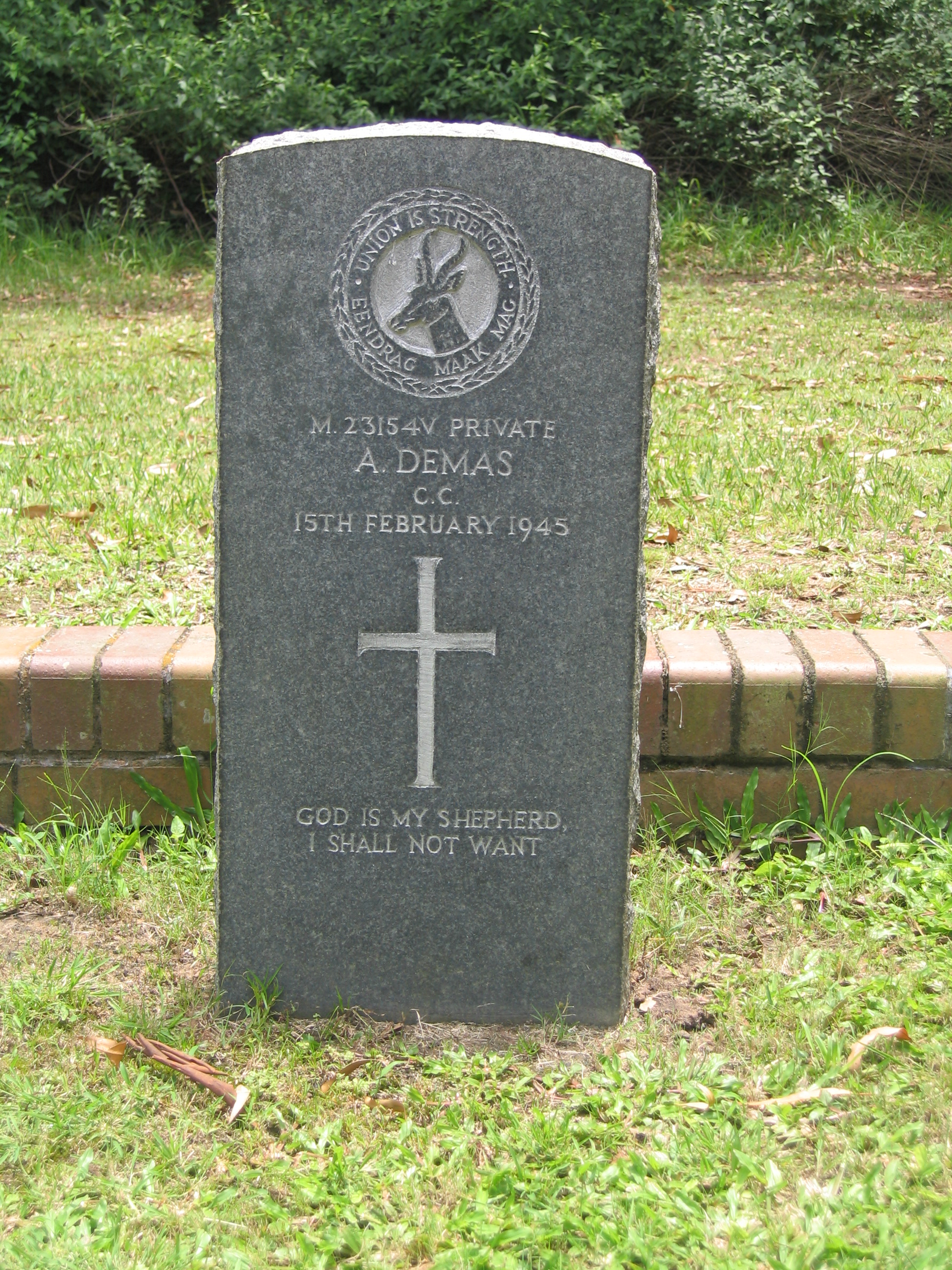 Son of Jan and Kaatjie Demas; husband of Elsie Demas, of Graaff-Reinet, Cape Province.