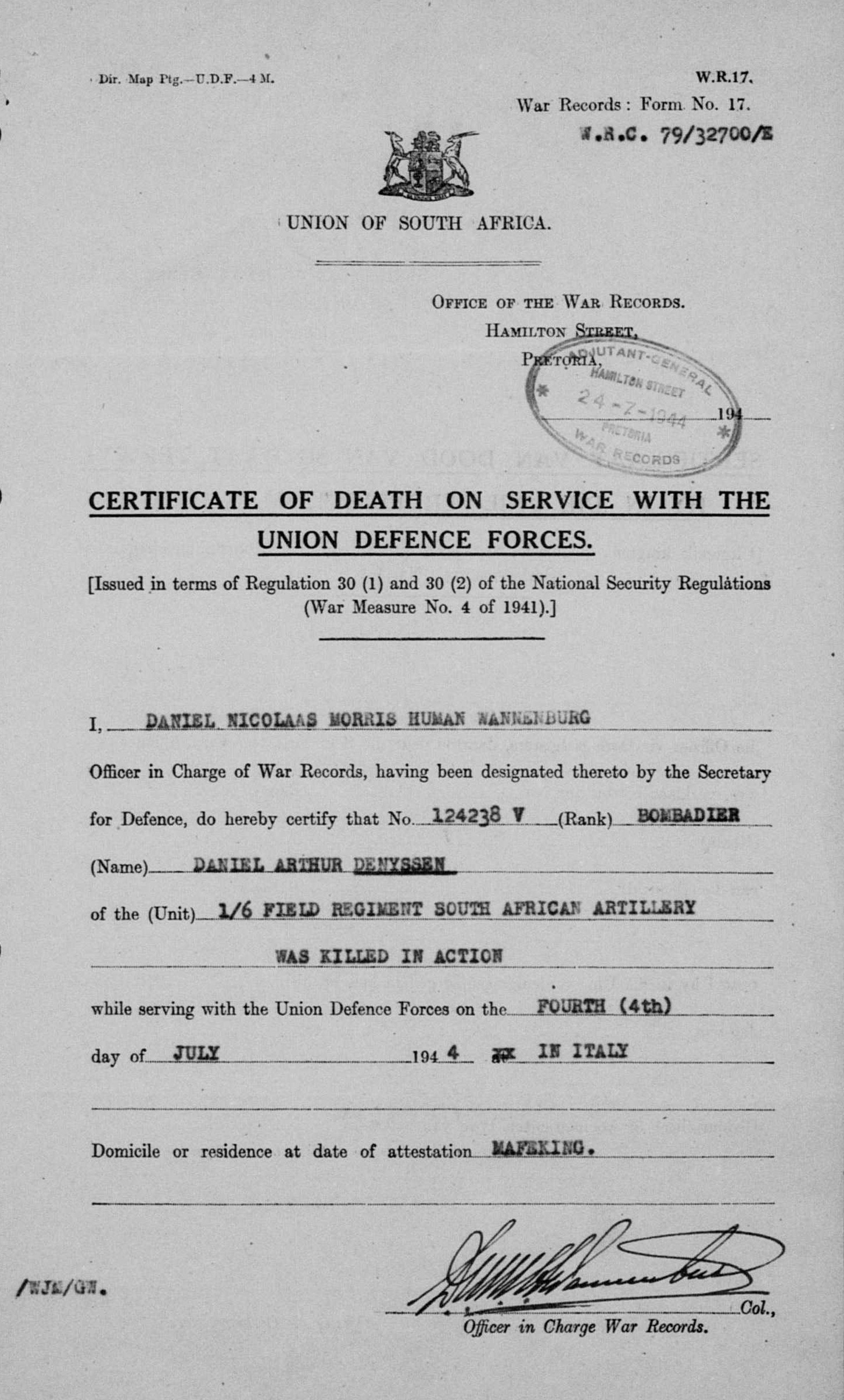 Son of Daniel Steven and Edith Alice Denyssen, of Normandale, Springfontein, Orange Free State, South Africa.