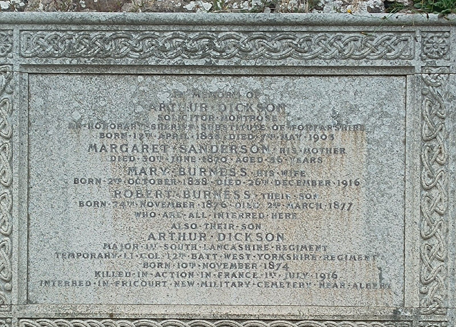 Son of Arthur Dickson (solicitor) and Mary Dickson, of Montrose. Commemorated on parents headstone in Montrose (Rosehill) Cemetery, Scotland. ref. South African Roll of Honour 1914-1918 |