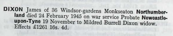 Son of George Dodds Dixon and Mary L. Dixon, of Stanmore, Middlesex; husband of Mildred Burrell Dixon (nee Waugh), of Durban, Natal, South Africa.