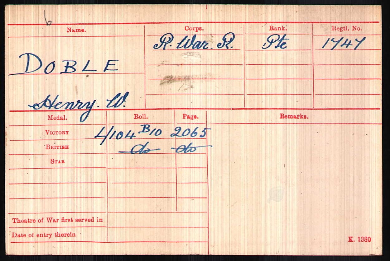 Son of George Robert and Elizabeth Phoebe (nee Wood) Doble, of c/o SAMR Bluff, Durban. Born Johannesburg. Previously served in German East Africa, with Natal R.N.V.R. His brother also died in service