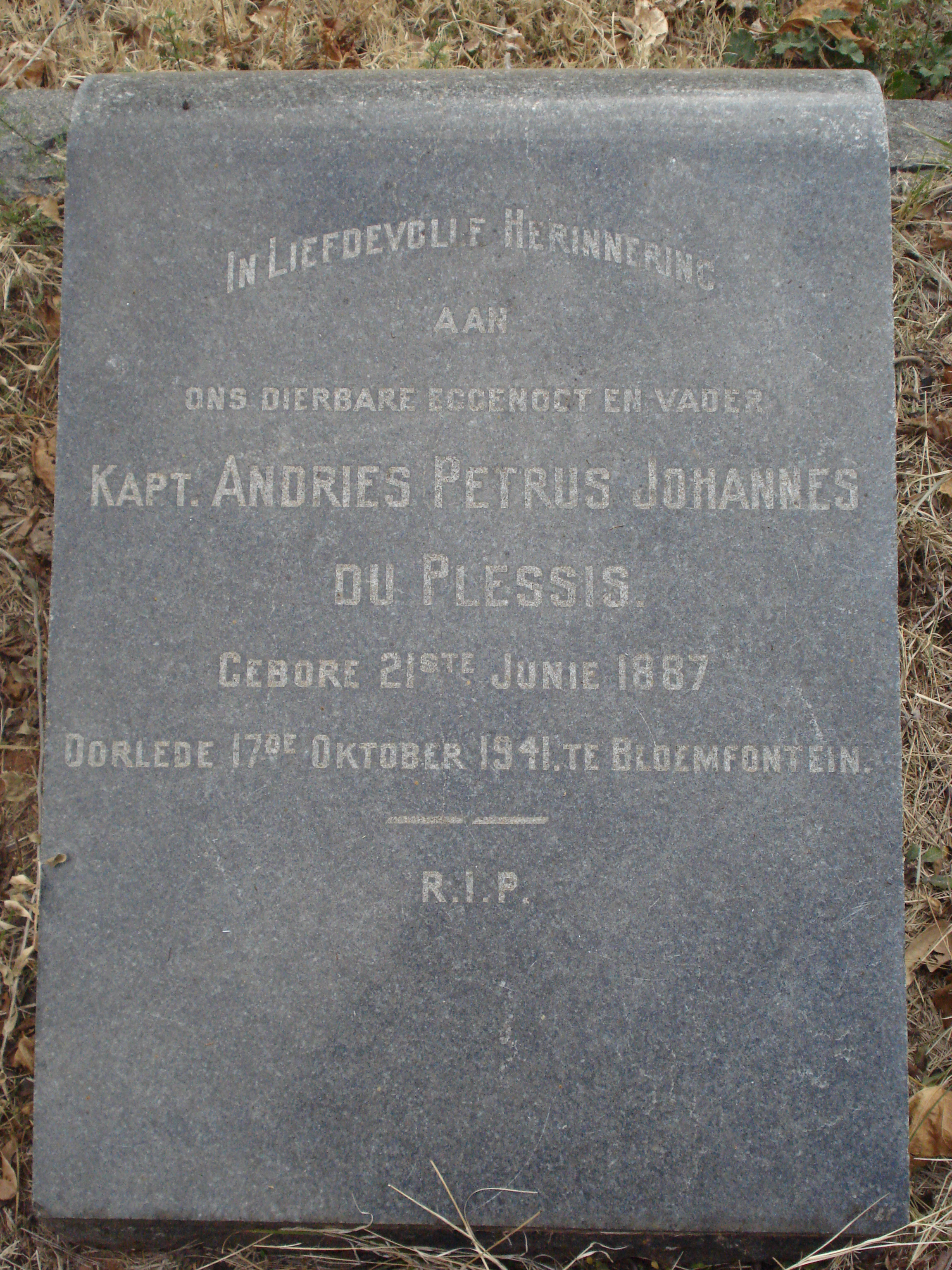 Husband of A. M. E. du Plessis, of Bloemfontein.