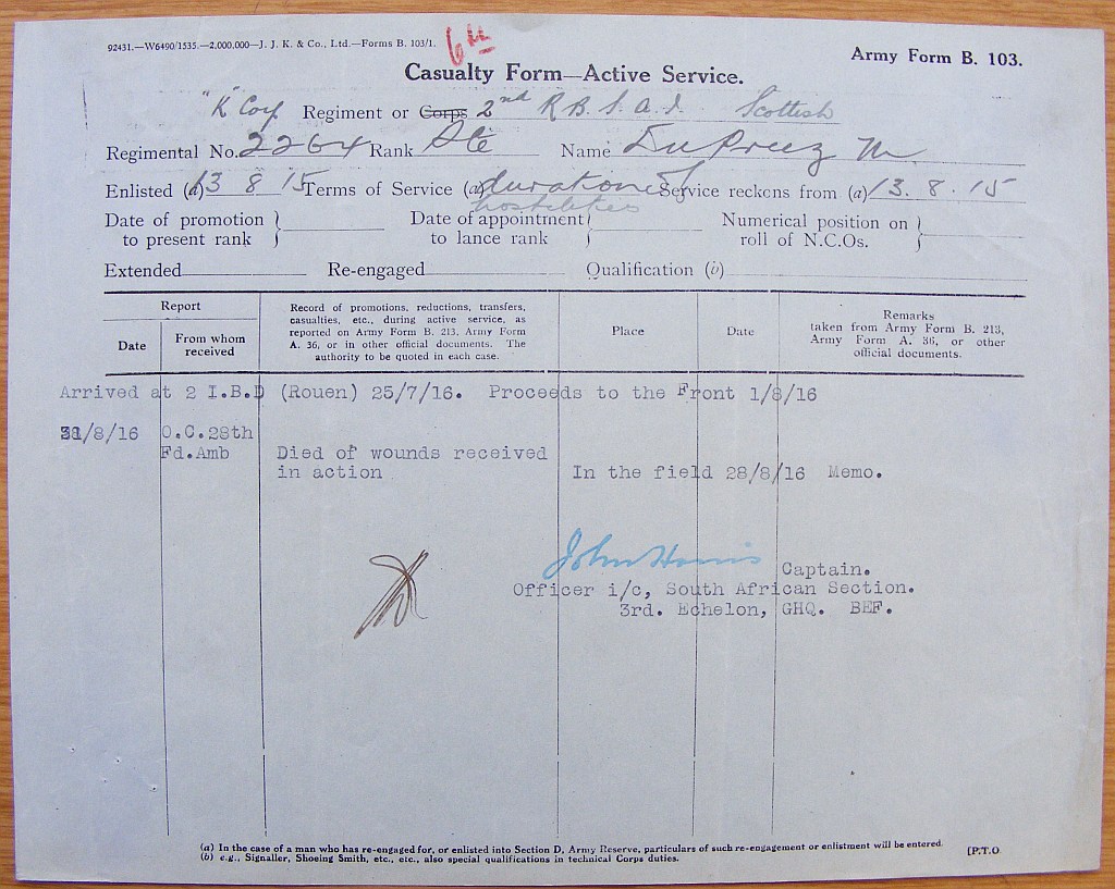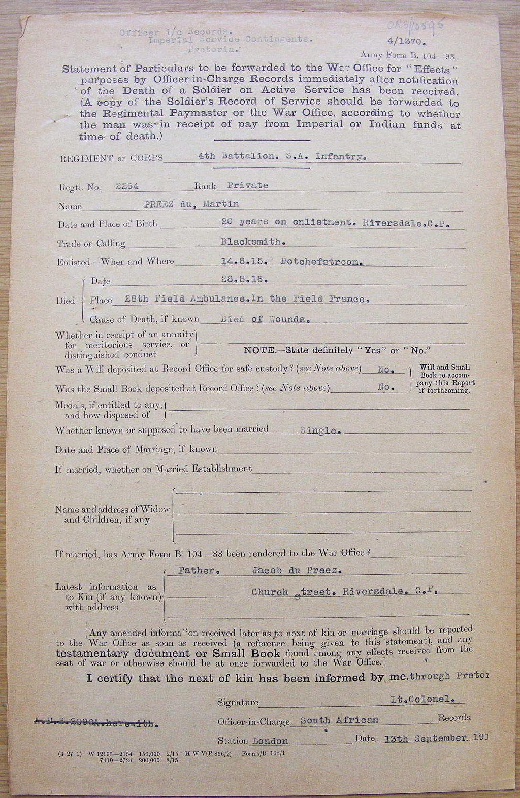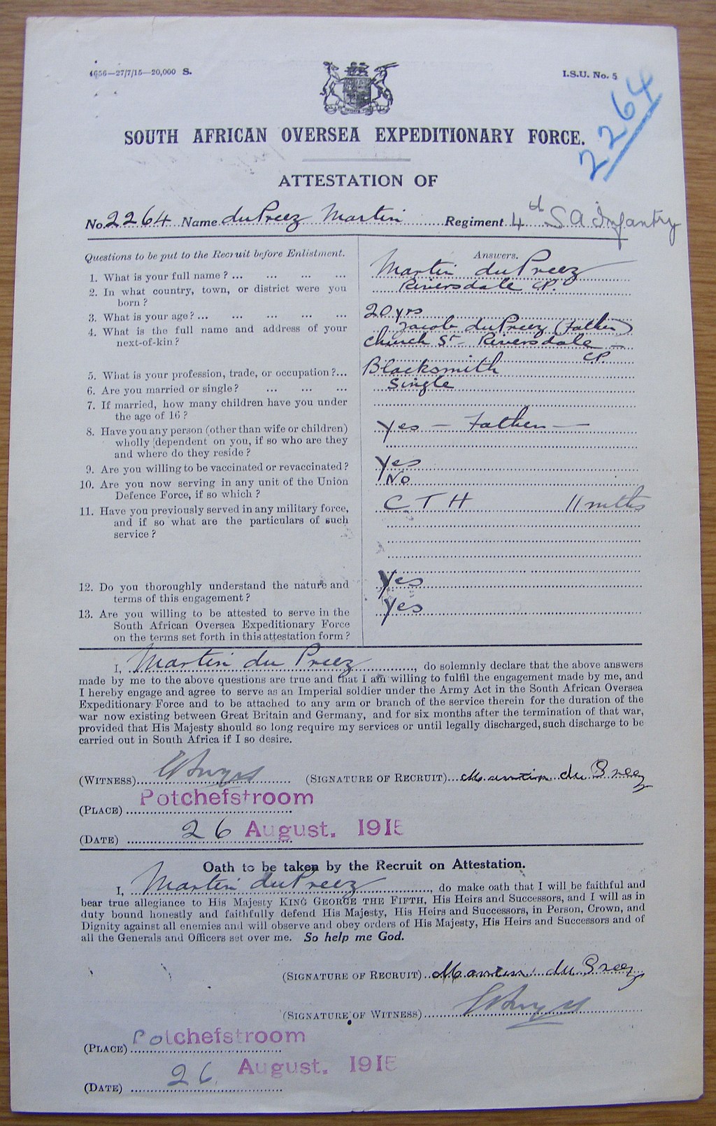 Son of Jacob Samuel and Johanna Gerhardia du Preez, of Church St., Riversdale, South Africa.