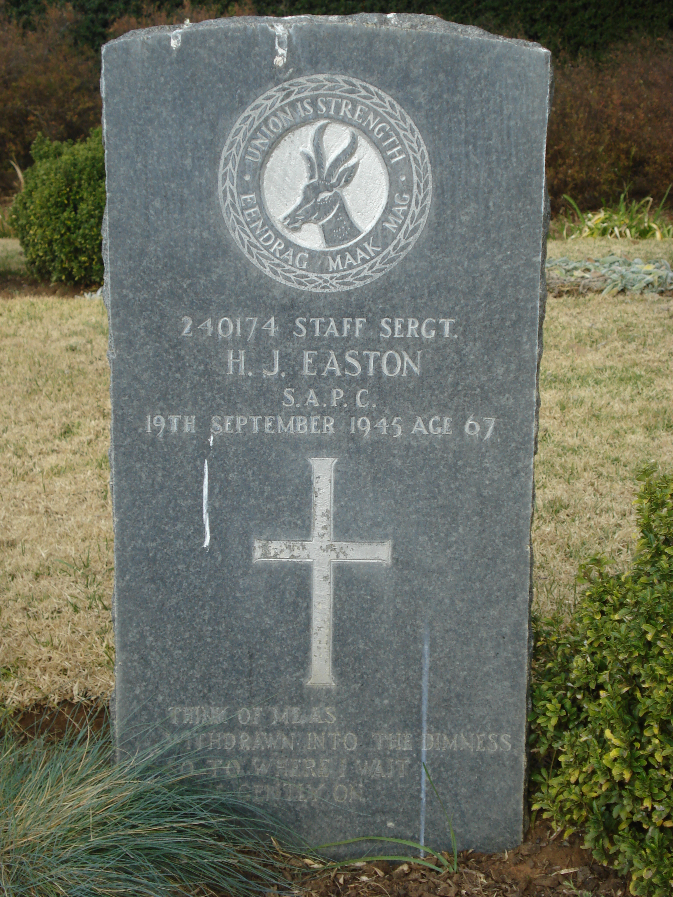 Son of James and Ada Easton; husband of Eva Easton, of Bloemfontein.