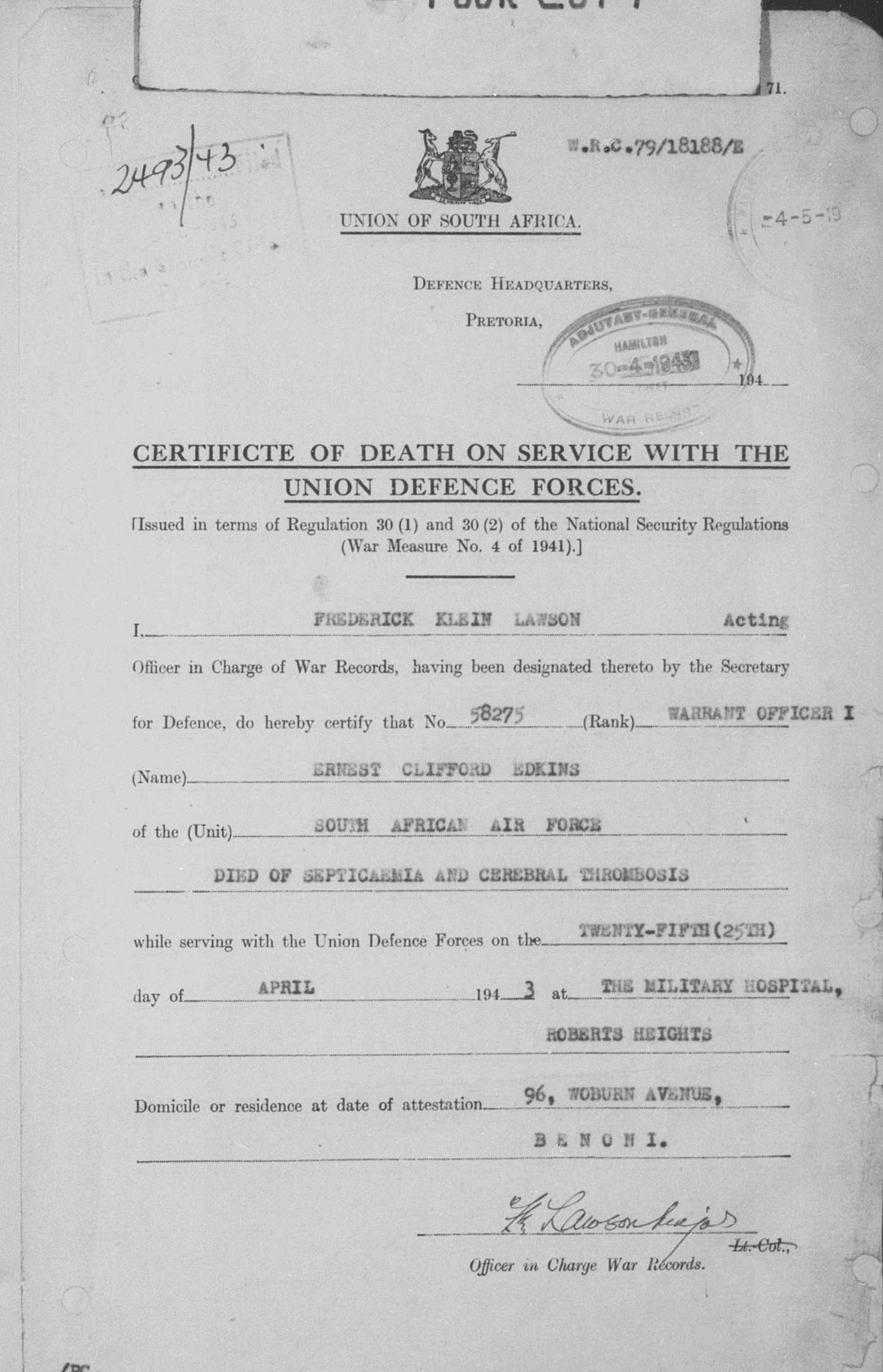 Husband of May Alice Edkins, of Benoni.