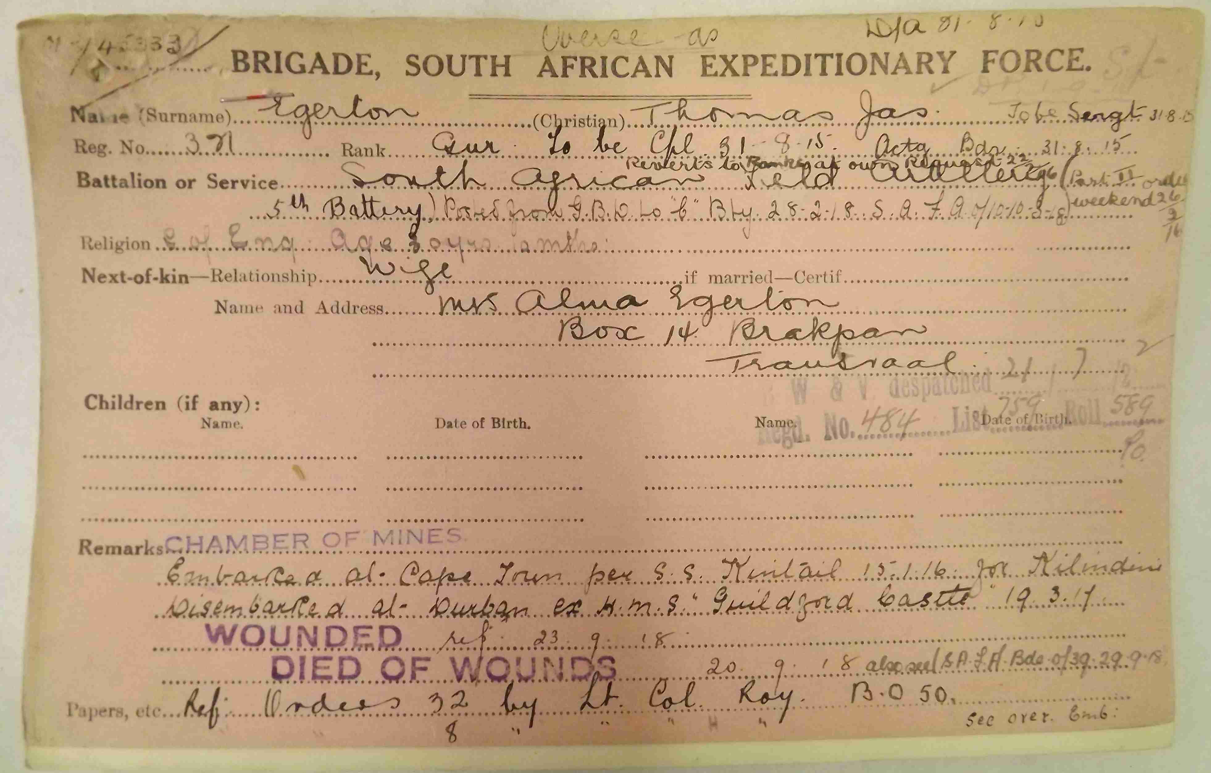 Son of James Joseph and Dorothy Egerton; husband of Alma Feodore Egerton, of 265, Jules St., Jeppes Extn., Transvaal, South Africa. Born at Colchester, England.