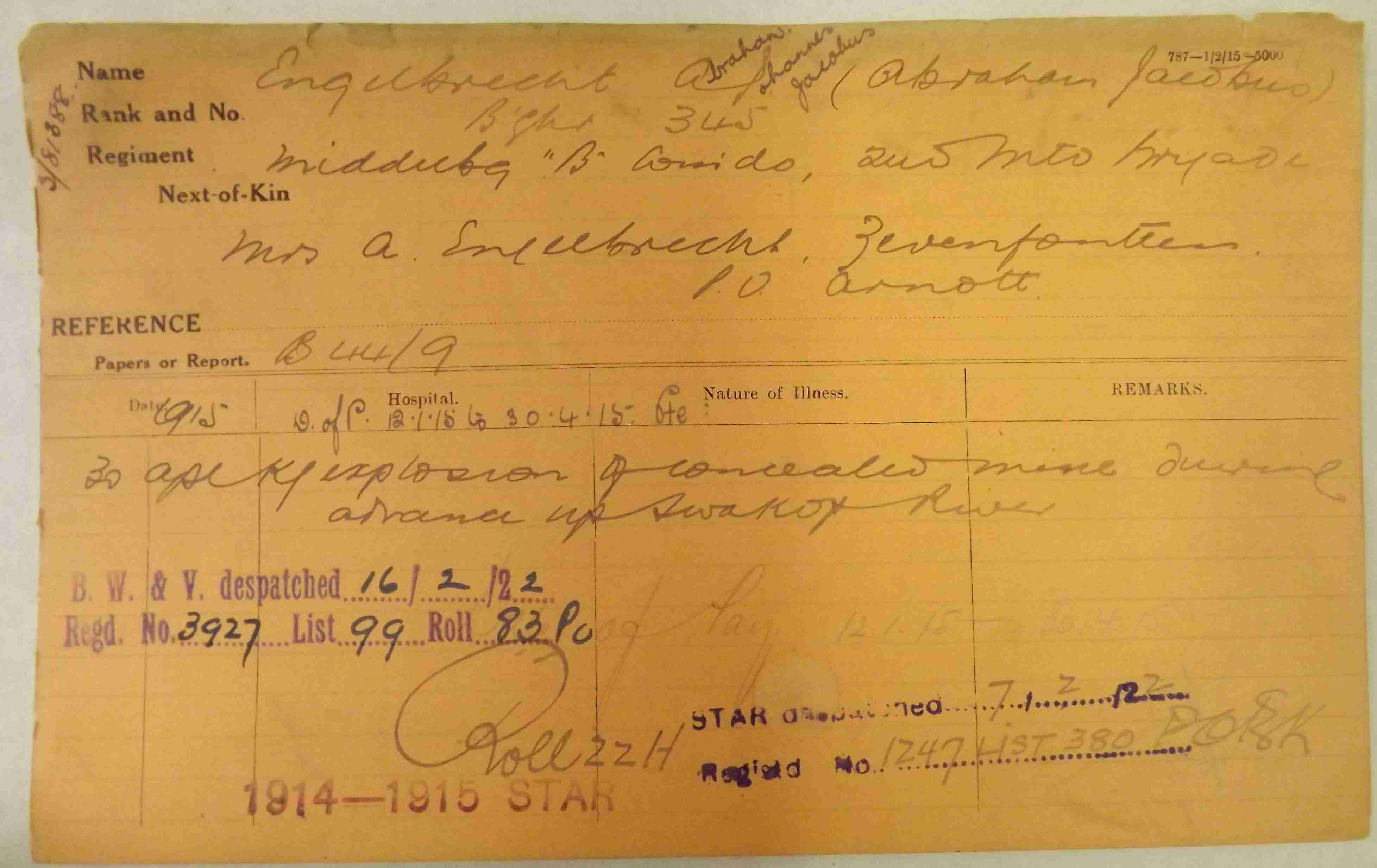 Son of Daniel Stephanus Johannes Engelbrecht and Alida Maria Hendrika Aletta Engelbrecht, of Langs St., Middelburg, Transvaal. |