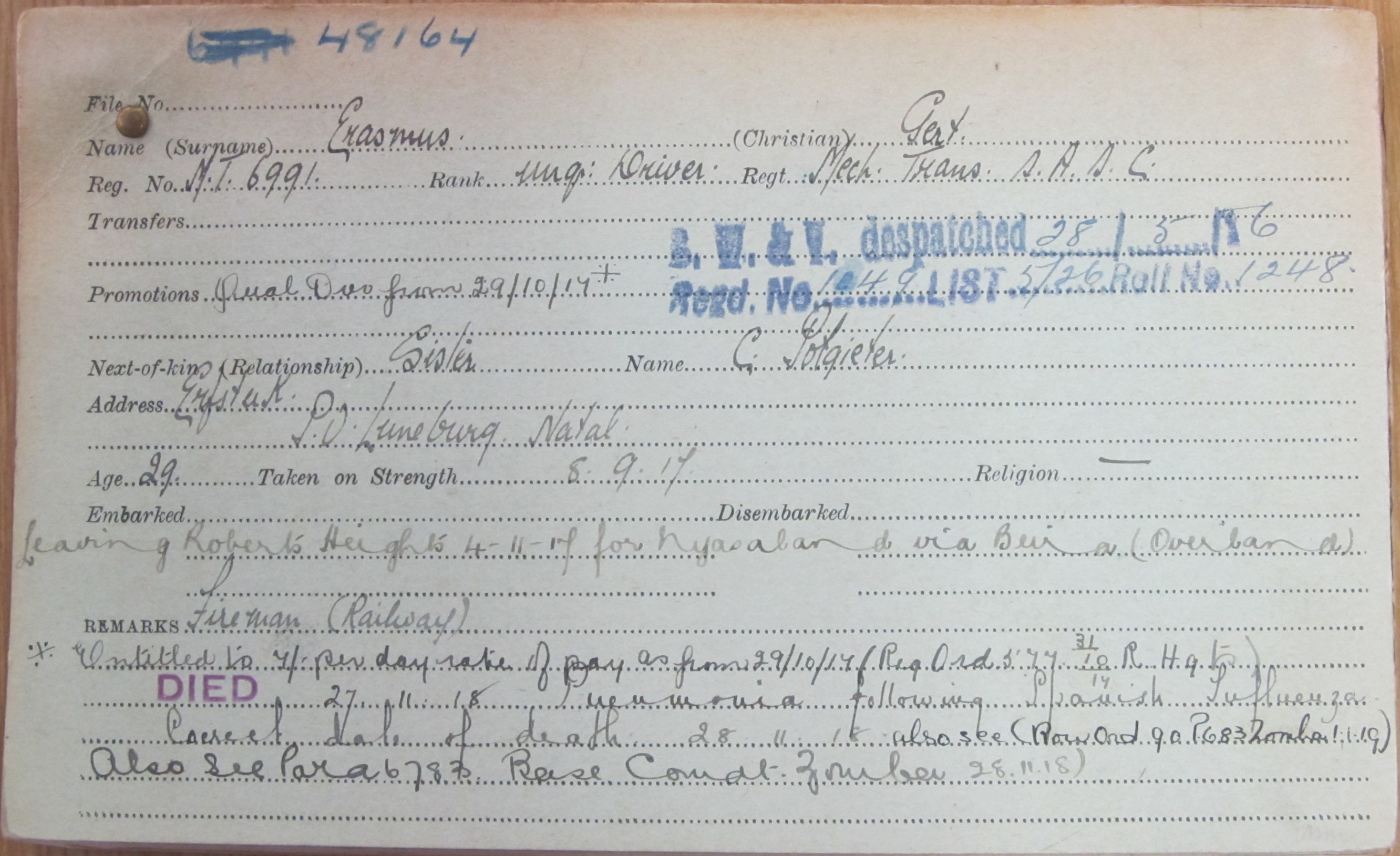 Son of Pieter Rasmus and Margaretha Petronella Erasmus. Brother of Mrs. C. Potgieter, of Erfstuk, P. O. Luneberg, Natal. Born Pietermaritzburg. A fireman on railways. ***CWGC has EAMTC
