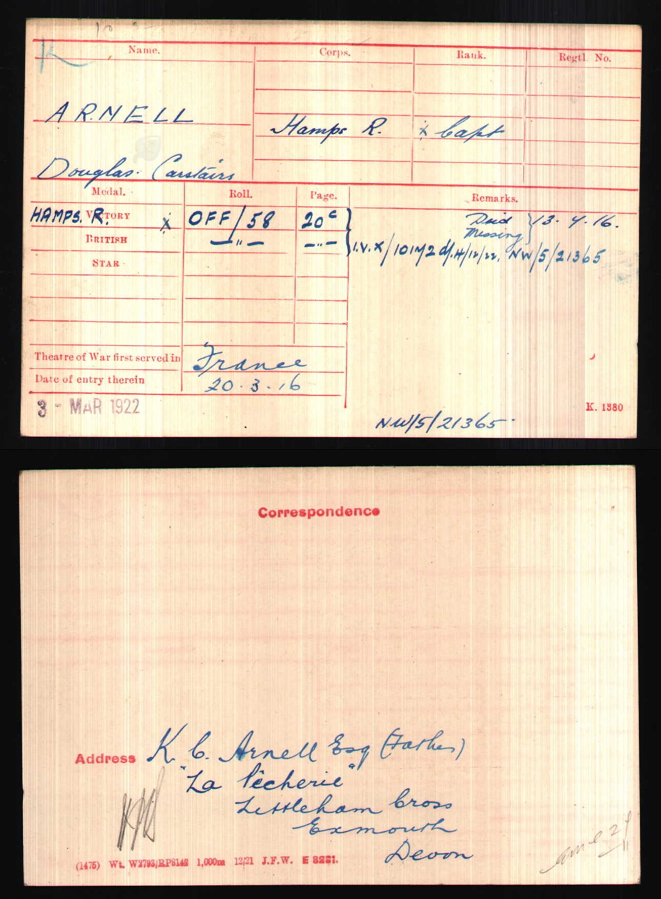 Son of Charles John and Eliza Julia Carstairs Arnell, of 16, Raleigh Villas, Exmouth, Devonshire. Served in the South African Campaign; also in German South West Africa. ref. South African Roll of Honour 1914-1918