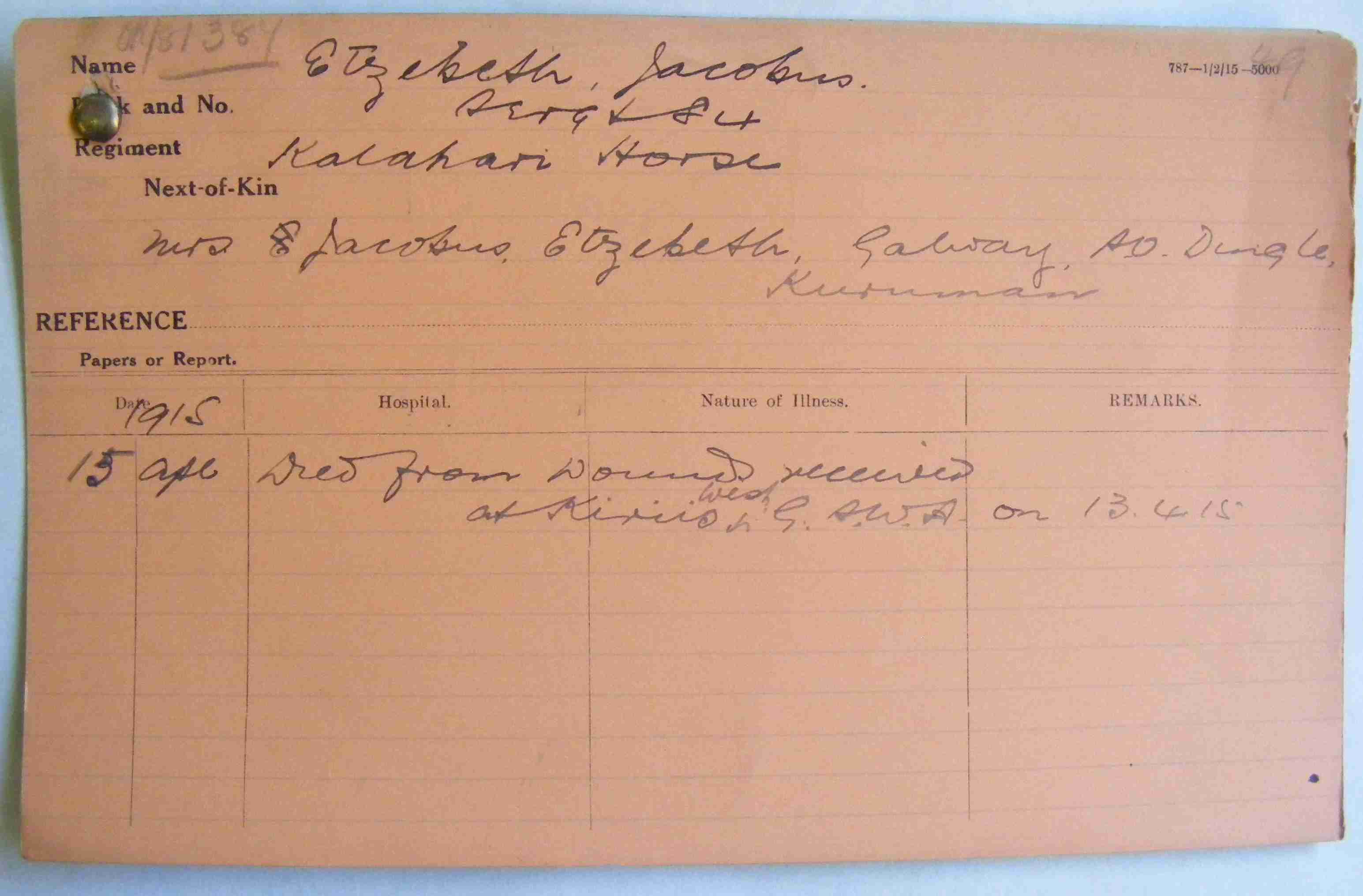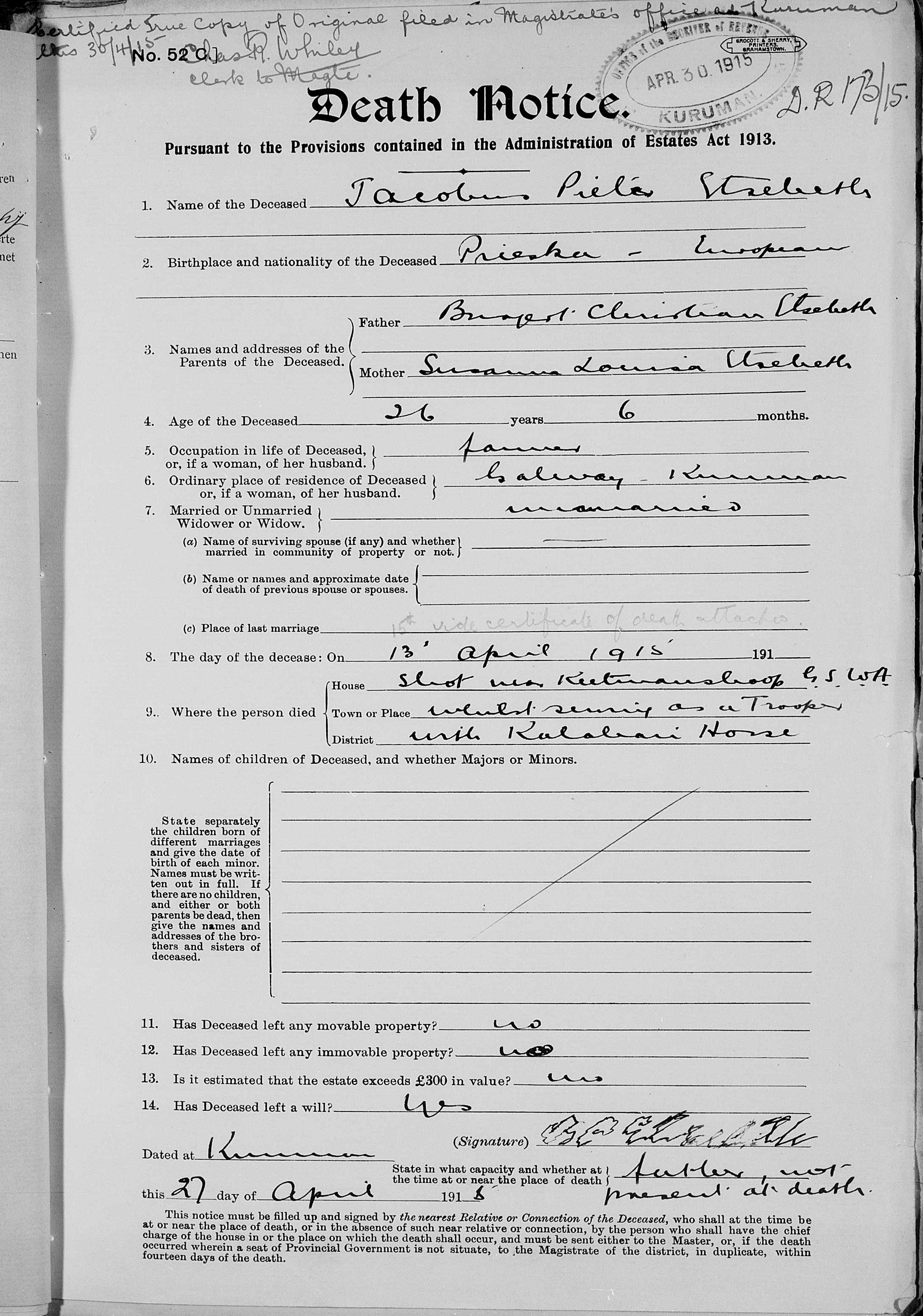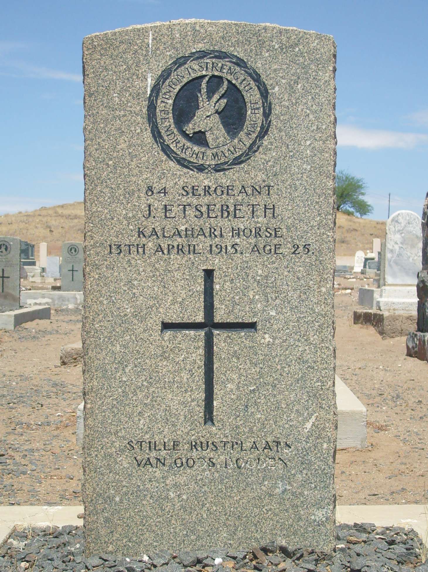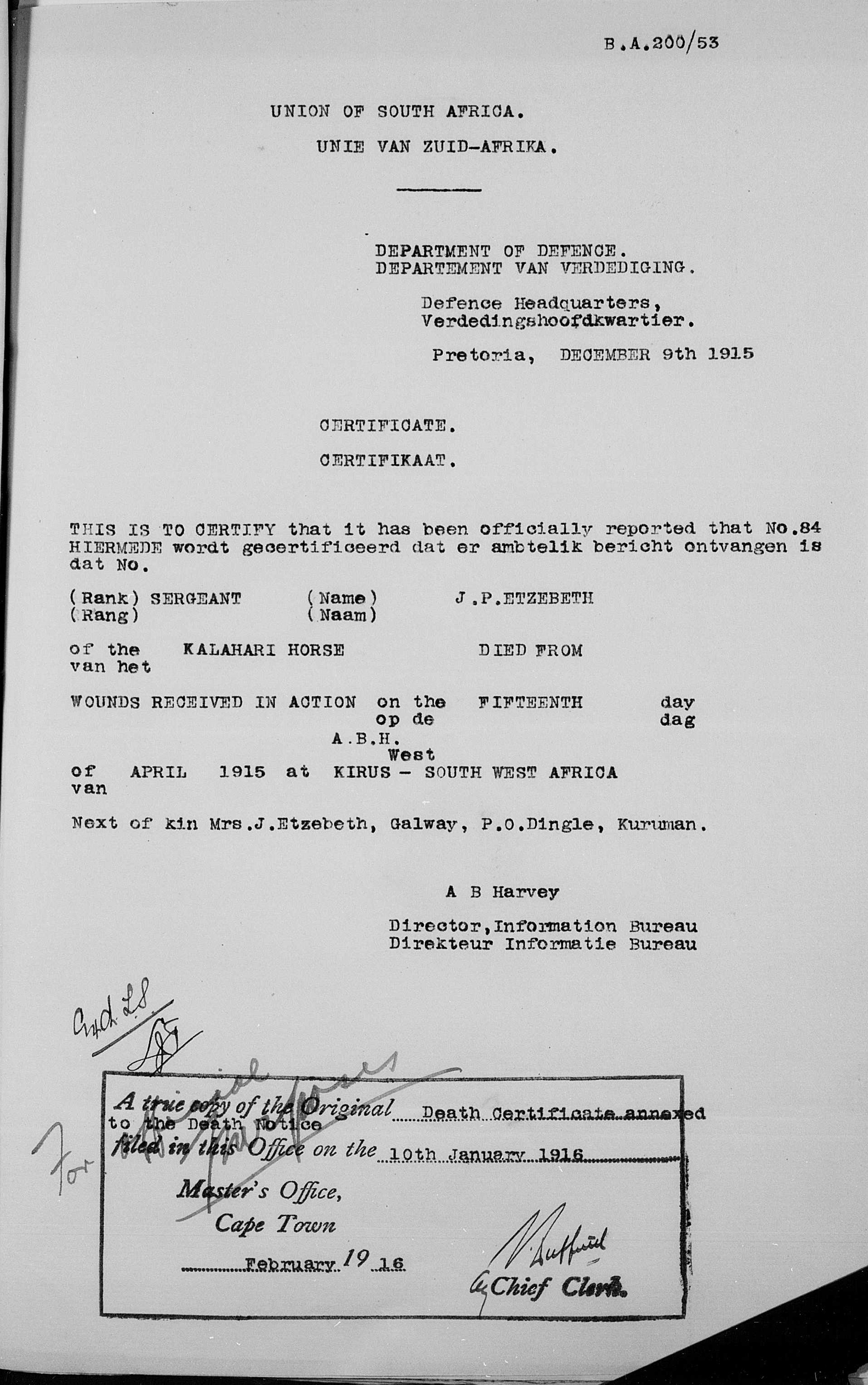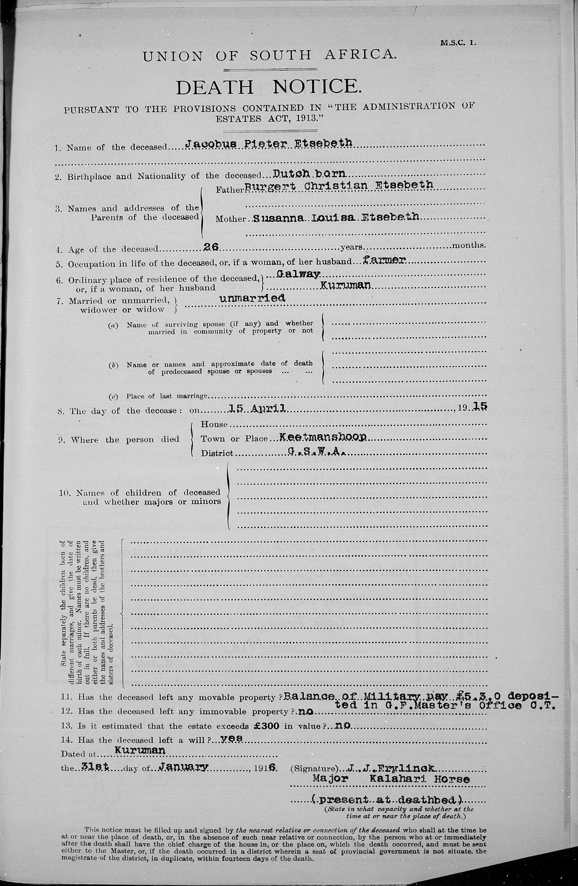 Son of Burgert Christiaan and Susanna Louisa Etsebeth, of Fochville, Transvaal. Born Prieska. A farmer. ***Might be ETZEBETH |
