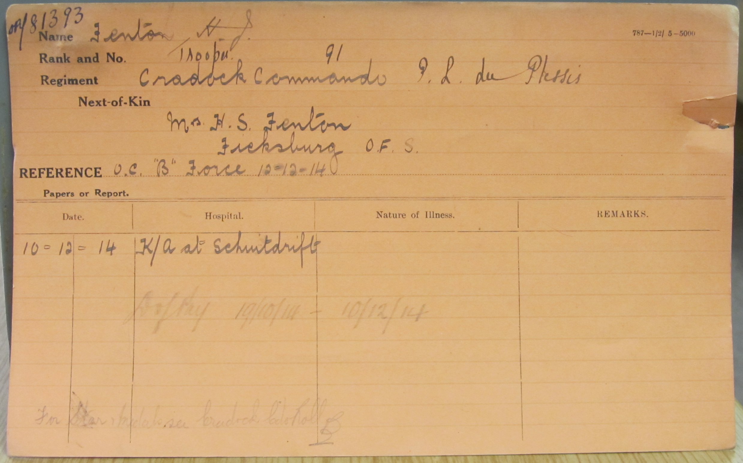 Next of kin, Mrs. H. S. Fenton, of Ficksburg, Orange Free State