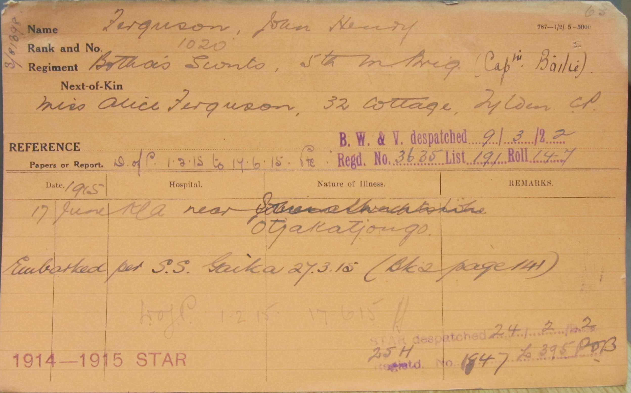 Son of James Thomas Fergusson and Jessie Ann Bennett, both originally from Scotland. Born Belgrave, Stutterheim District. His brother A W F Bennett also died in service. On Cathcart War Memorial