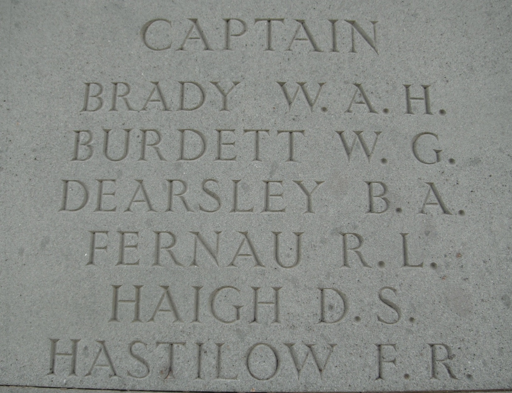 Son of Edmond Bernard and Ethel Elizabeth Camille Fernau; husband of Barbara Eva Fernau, of Rolvenden Layne, Kent. On Knysna War Memorial |
