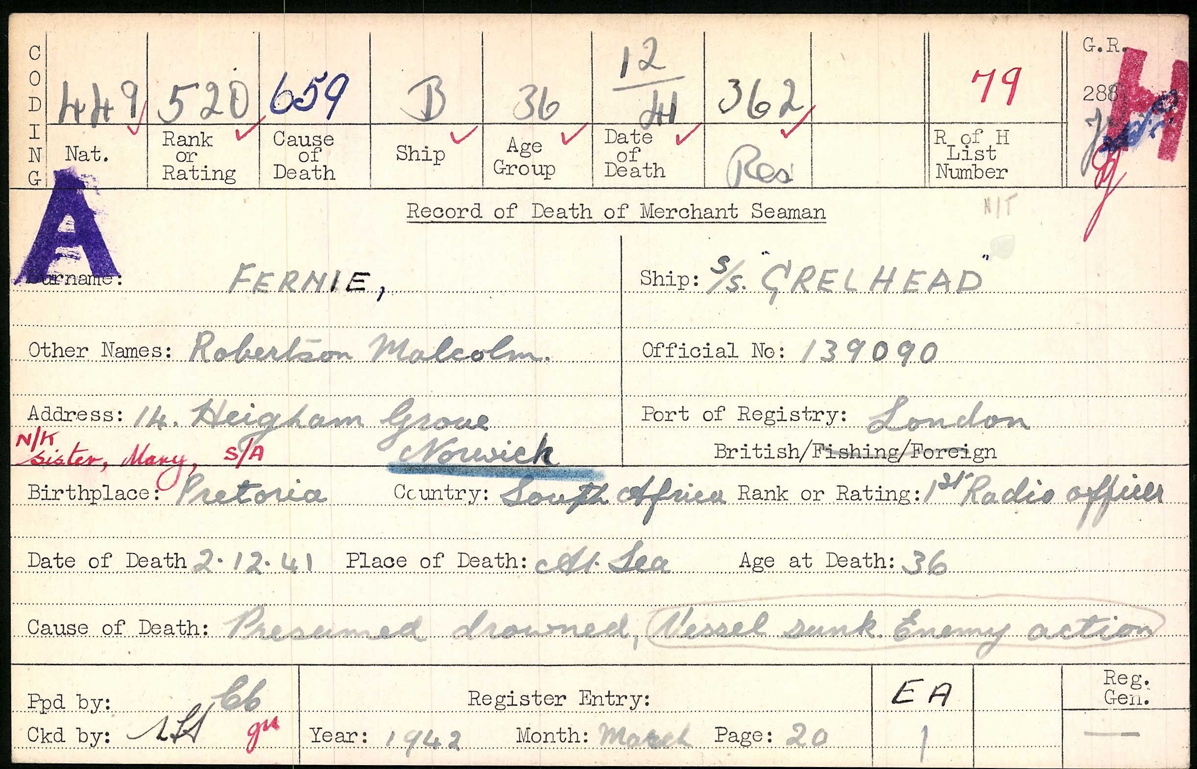 Son of Lt.-Col. Ralph Fernie and Ursula Maude Fernie; stepson of Elizabeth Fernie, of Thorpe, Norwich. ref. South African Roll of Honour 1939-45 |