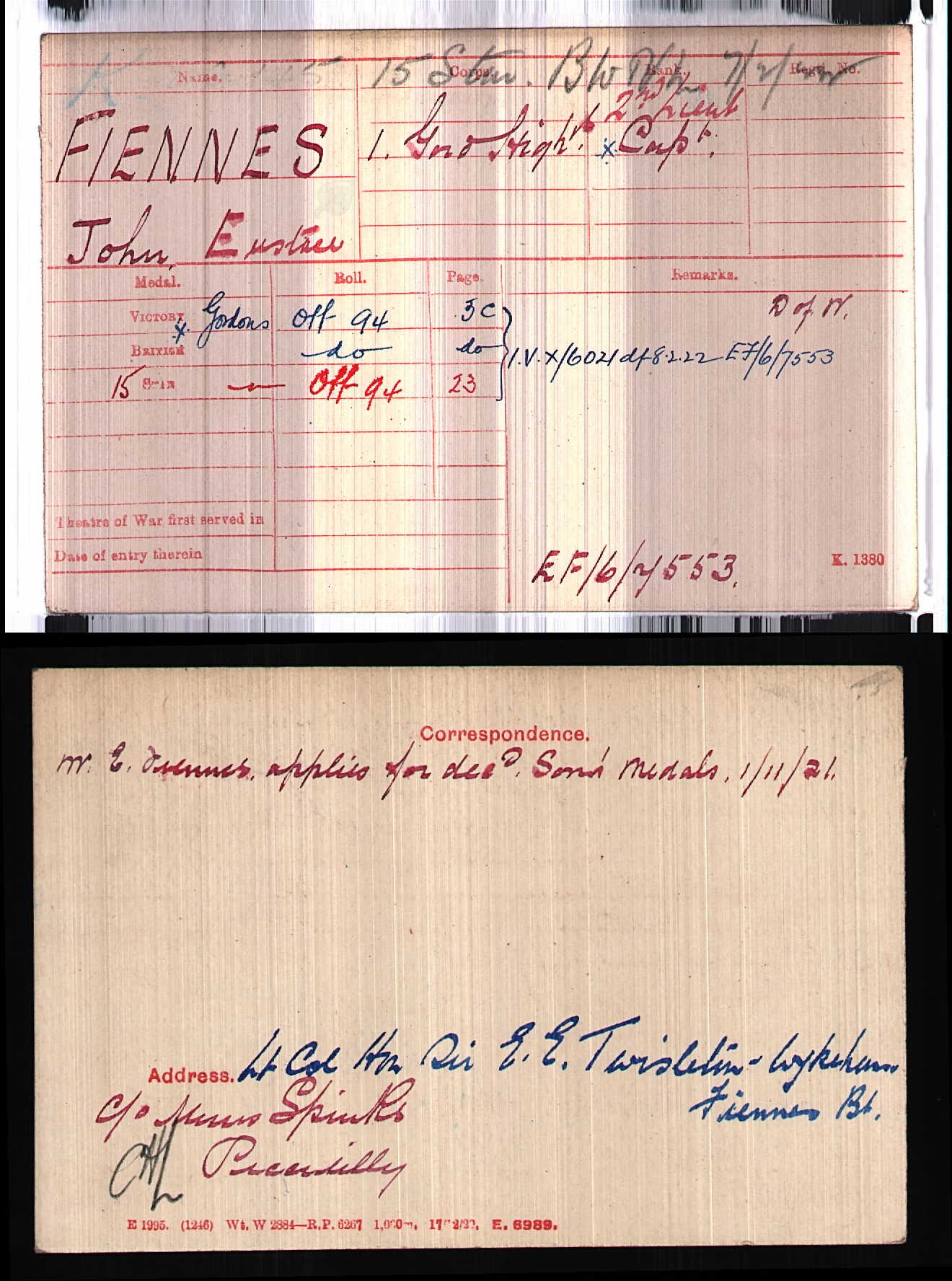 Son of Lt. Col. The Hon. Sir Eustace Fiennes, Bart., Governor of Leeward Islands, and the Hon. Lady Fiennes, O.B.E., of Government House, Leeward Islands, B.W.I. ref. South African Roll of Honour 1914-1918