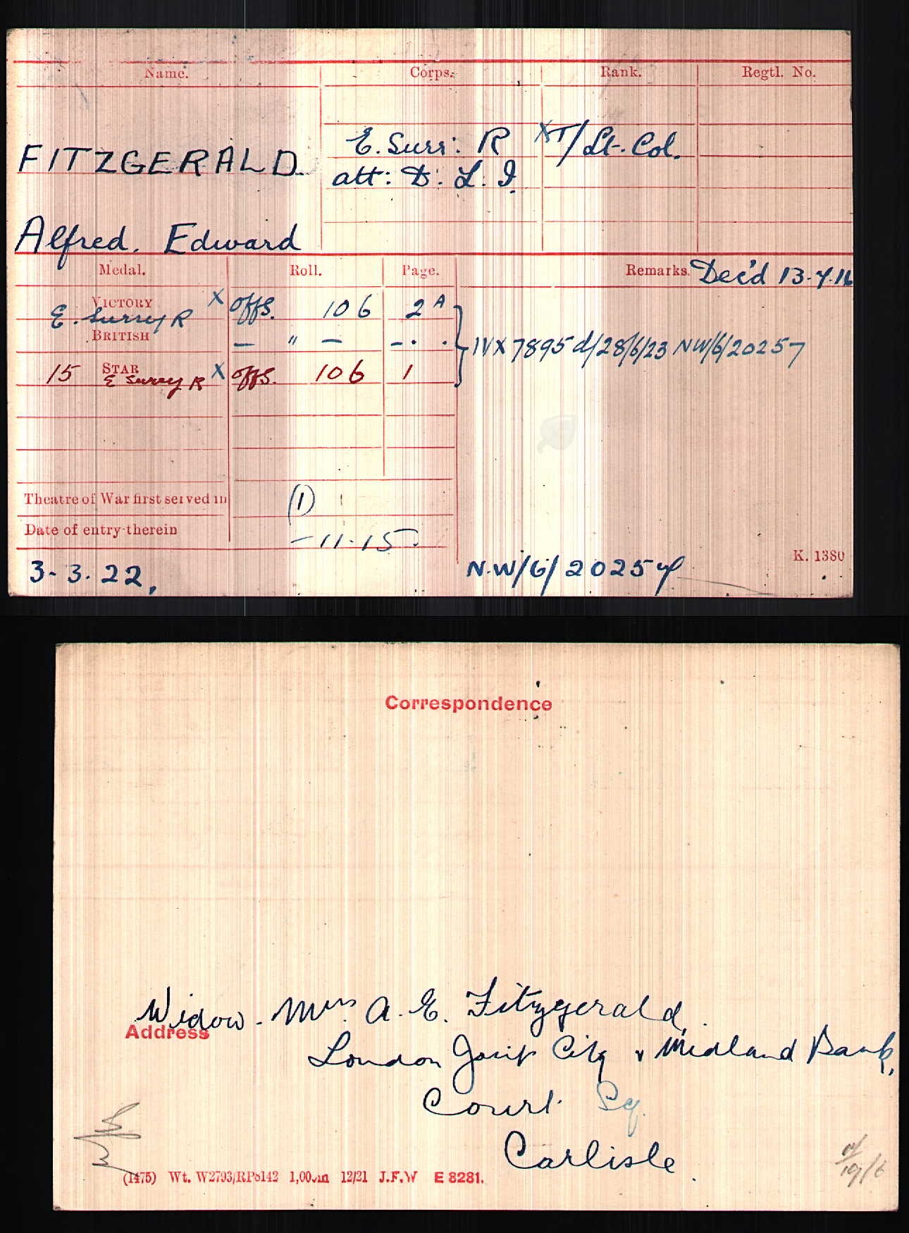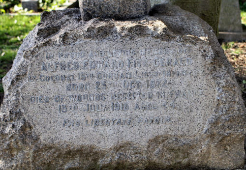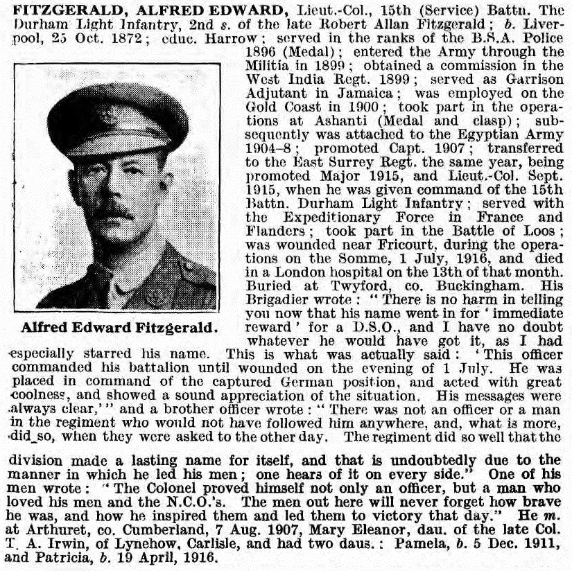 Son of the late Robert Allan Fitzgerald and Mrs. Blewettref, of the Manor House, Aylesbury. Husband of Mary Eleanor Fitzgerald (nee Irwin). Served in British South Africa Police 1896. Well known as a cricketer in India and West Indies and member of MCC. South African Roll of Honour 1914-1918