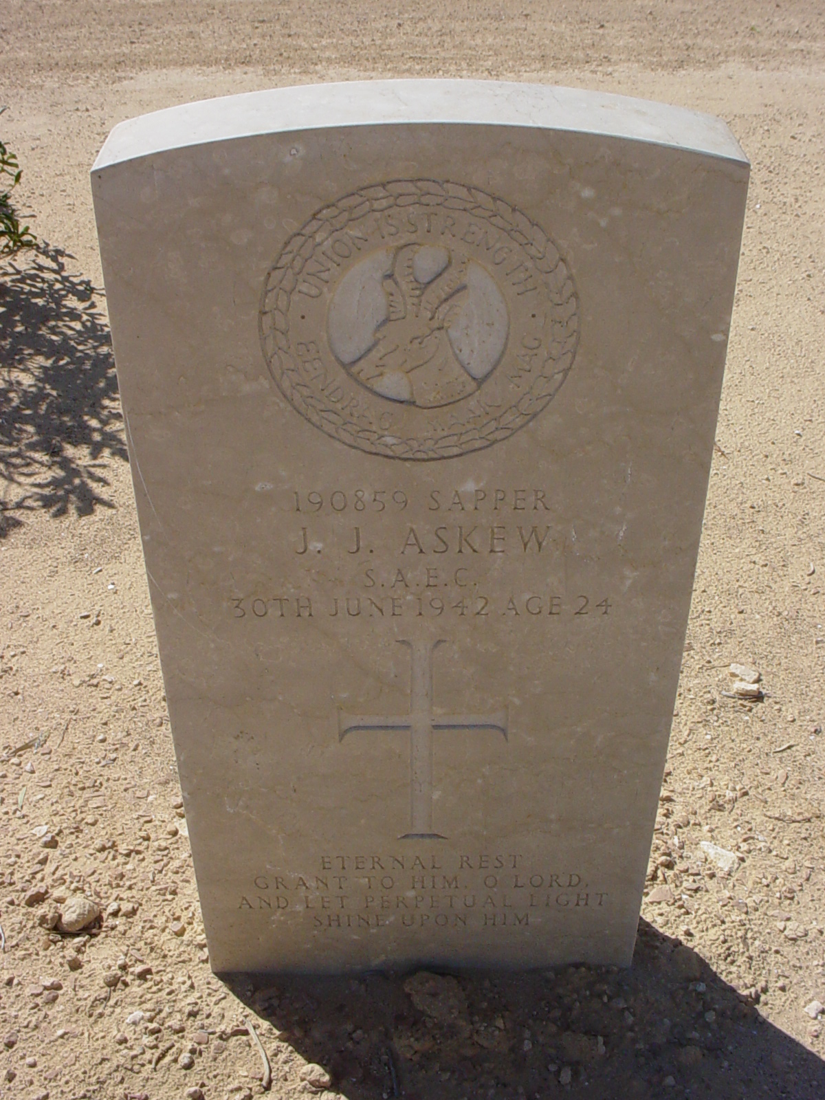 Son of John and Ellen J. Askew, of Port Elizabeth, Cape Province, South Africa. Commemoration stone in Port Elizabeth (South End) Cemetery