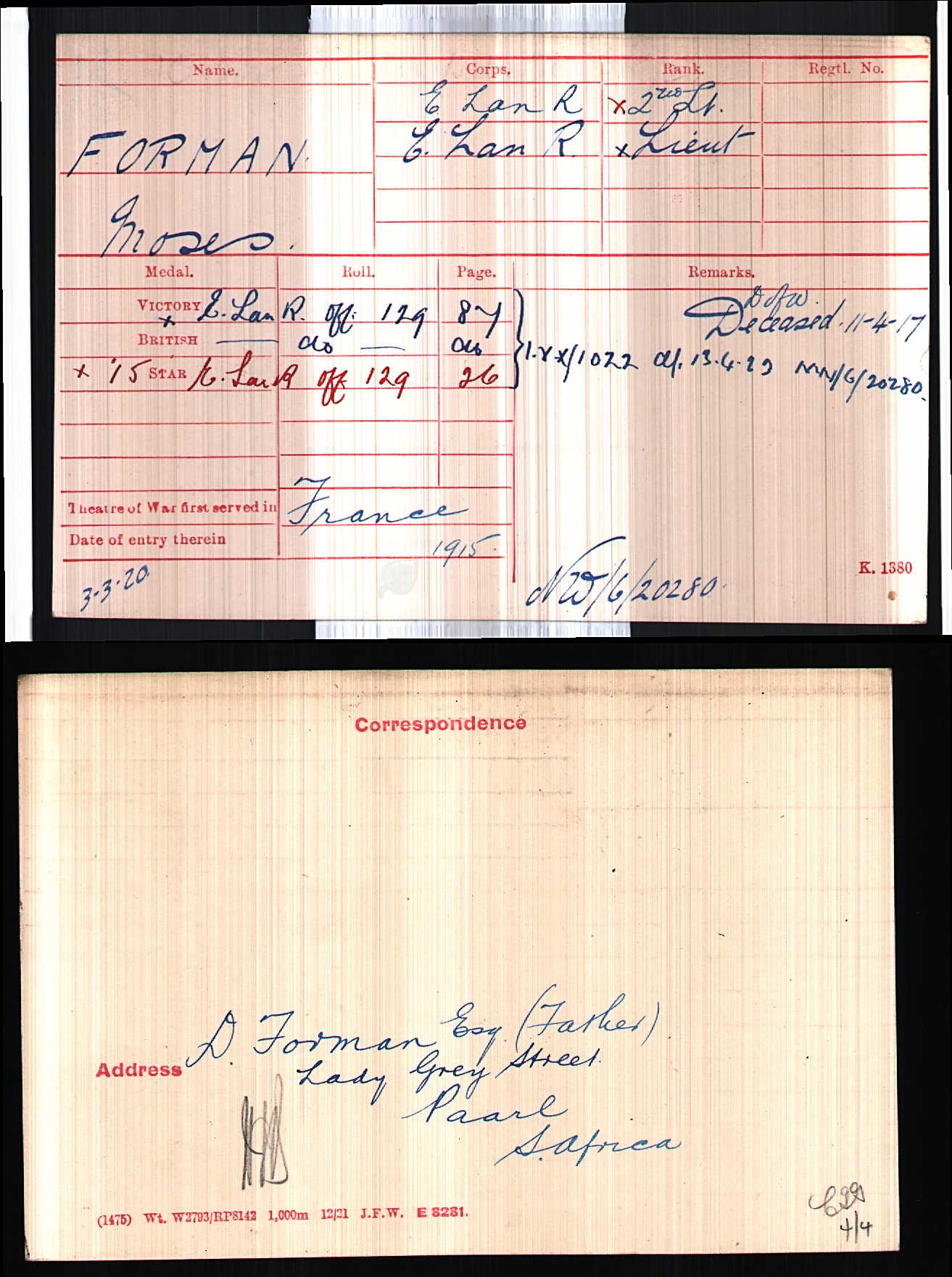 Son of David and Bethsheba Forman, of Paarl, Cape Province, South Africa. On Harrismith War Memorial, Free State ***Jewish