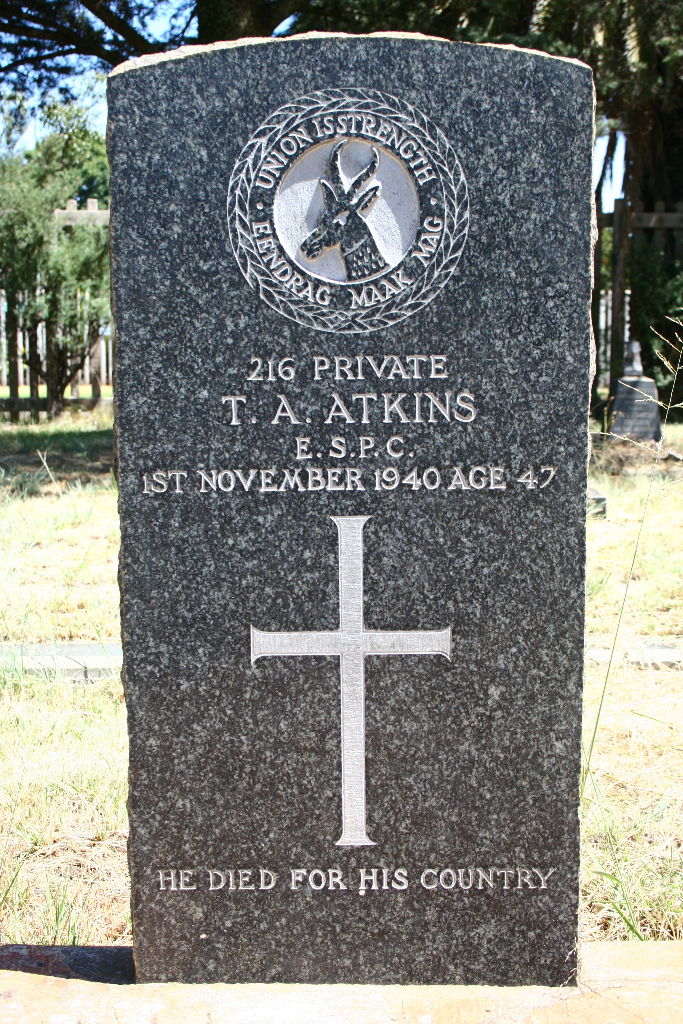 Died of injuries, received in train accident, while standing guard at night on the Olifants River Bridge near Witbank when the oncoming train struck him. He was placed in the train and taken to Witbank where he died without regaining consciousness |