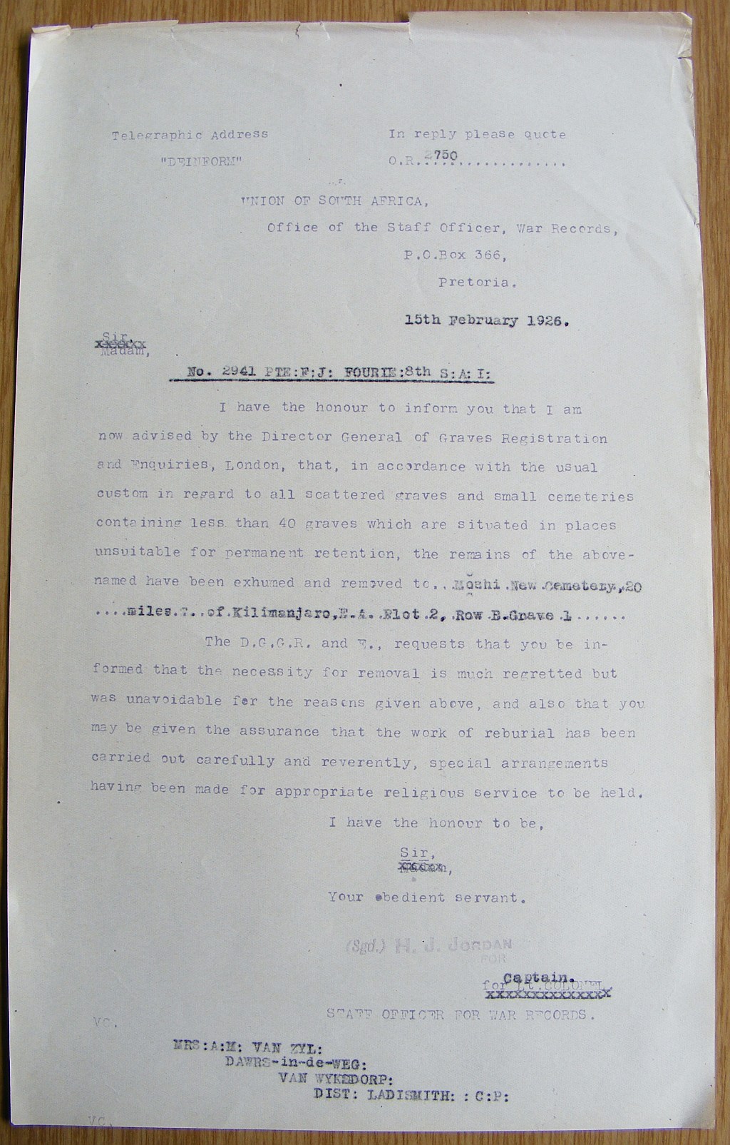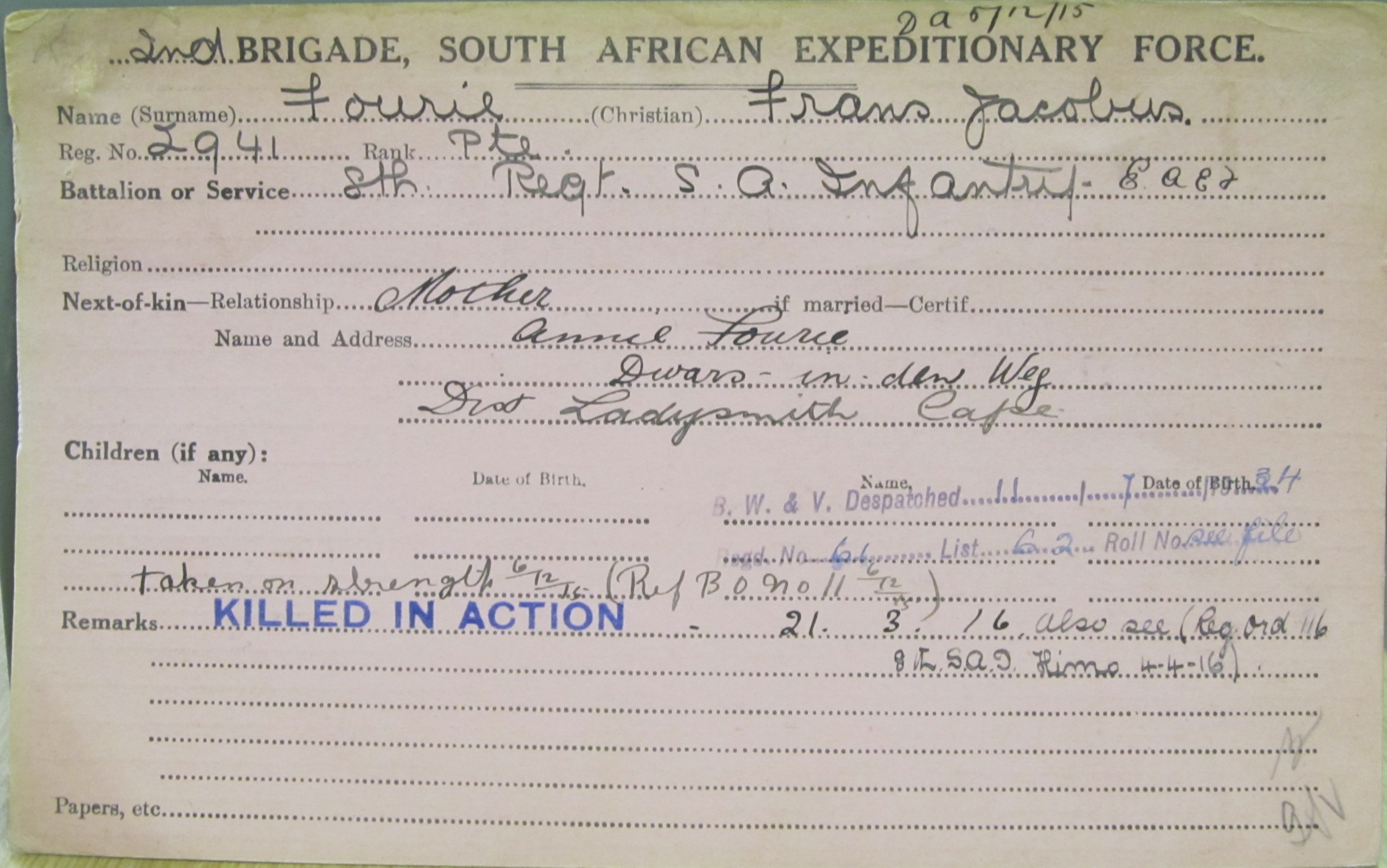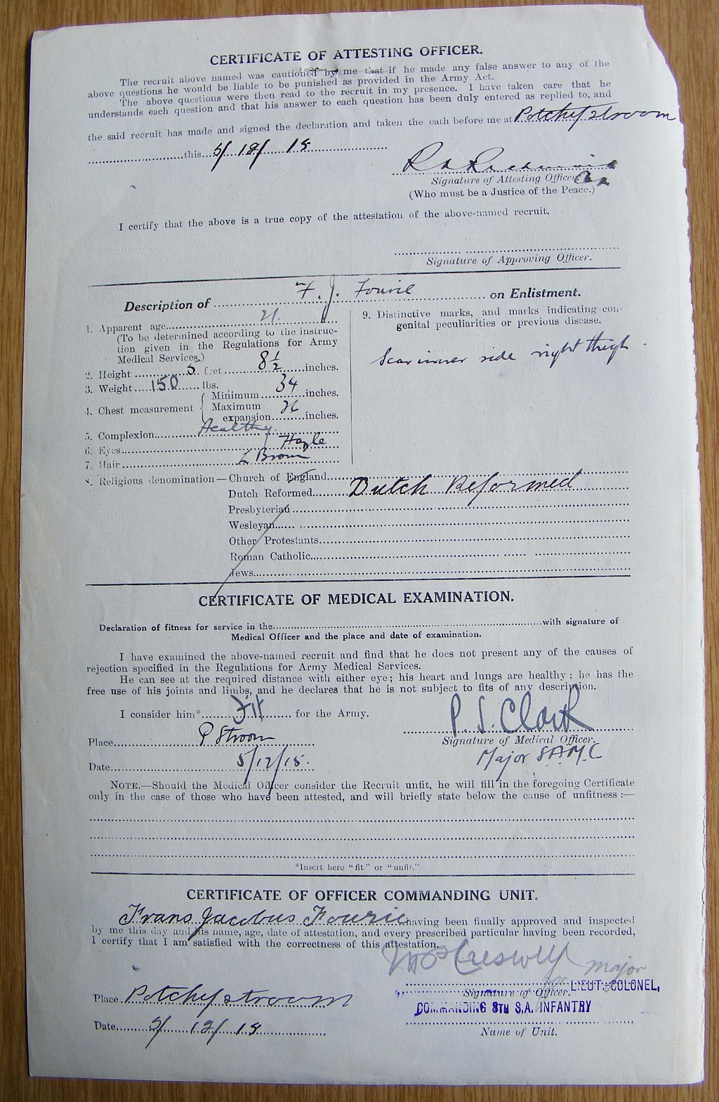 Son of Frans Engelbertus Fourie and Anna Maria (nee van Zyl) Fourie, of Dwars-en-den-wey, District Ladysmith, Cape Province. Born District Calitzdorp. A farmer. |