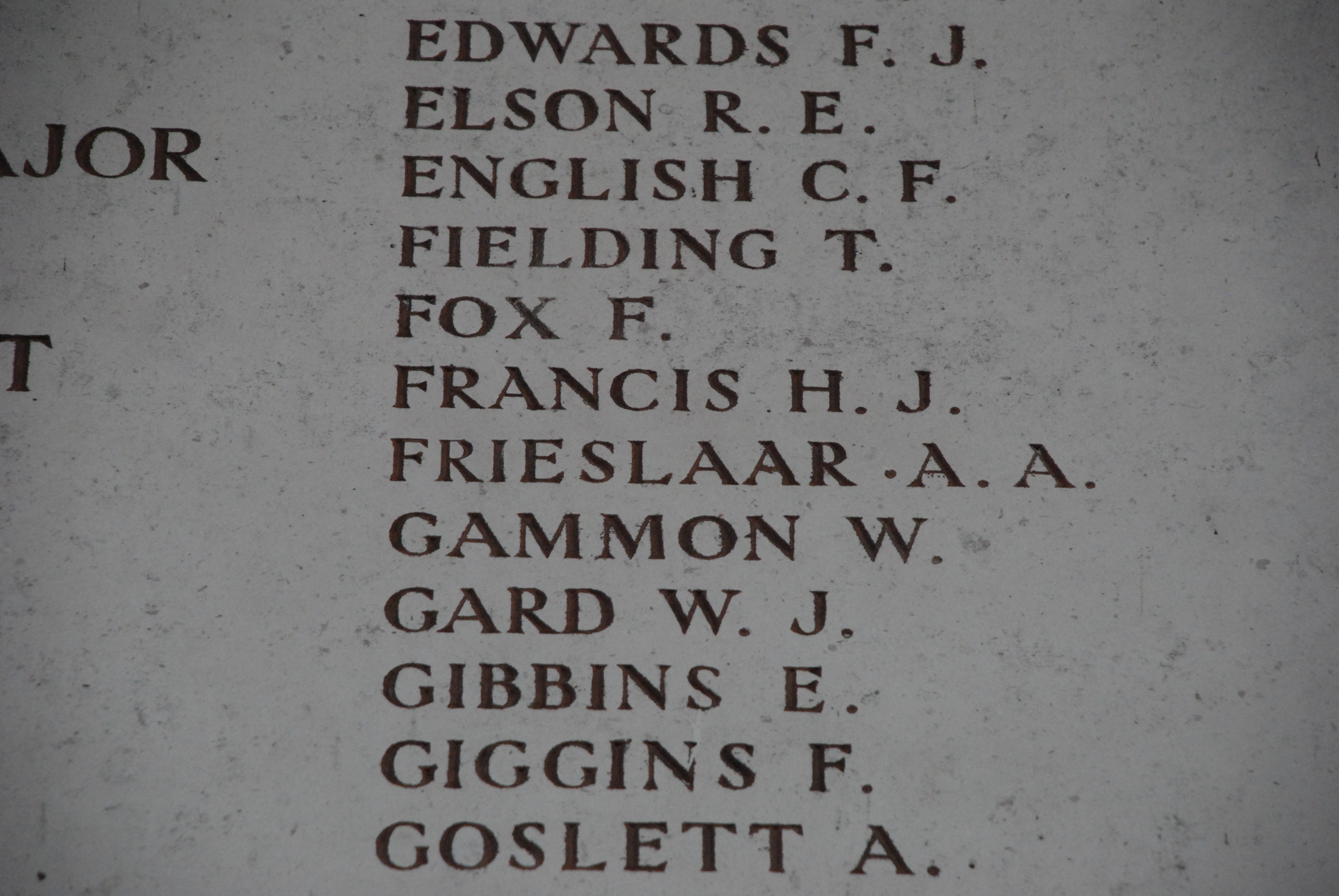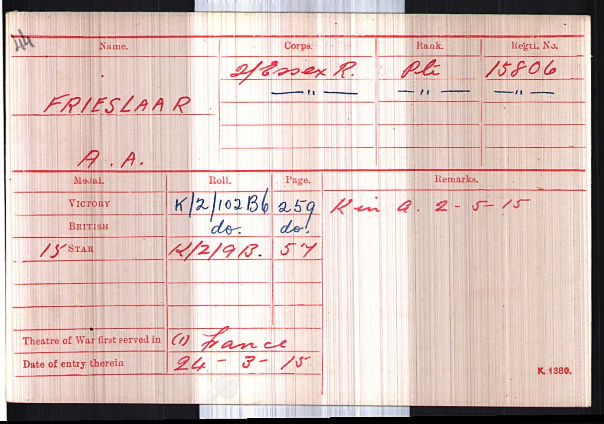 Son of Gerrit William and Elizabeth Maria Frieslaar. Brother of Miss H. Frieslaar, of Newslands, Cape Province. A rigger in Selborne Dockyard. Born Simon's Town, enlisted Cape Town, resided at Newlands, South Africa. ref. Soldiers Died in Great War CD. ***Might be ALBERT ALFRED ROBERTSON Frieslaar
