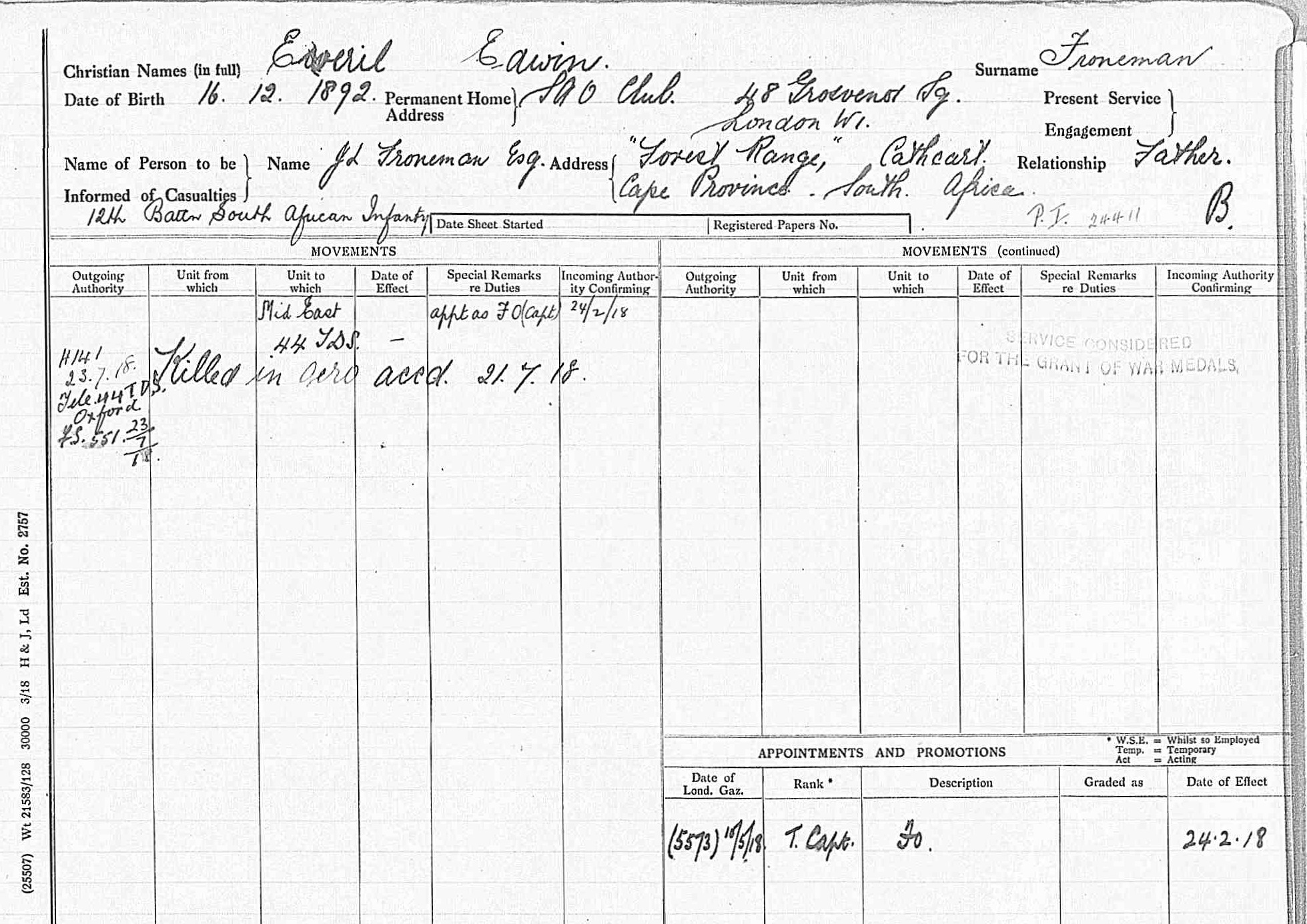 Son of Jacob Louis Froneman; husband of Henrietta Froneman, of Union St., Cathcart, Cape Province, South Africa. |