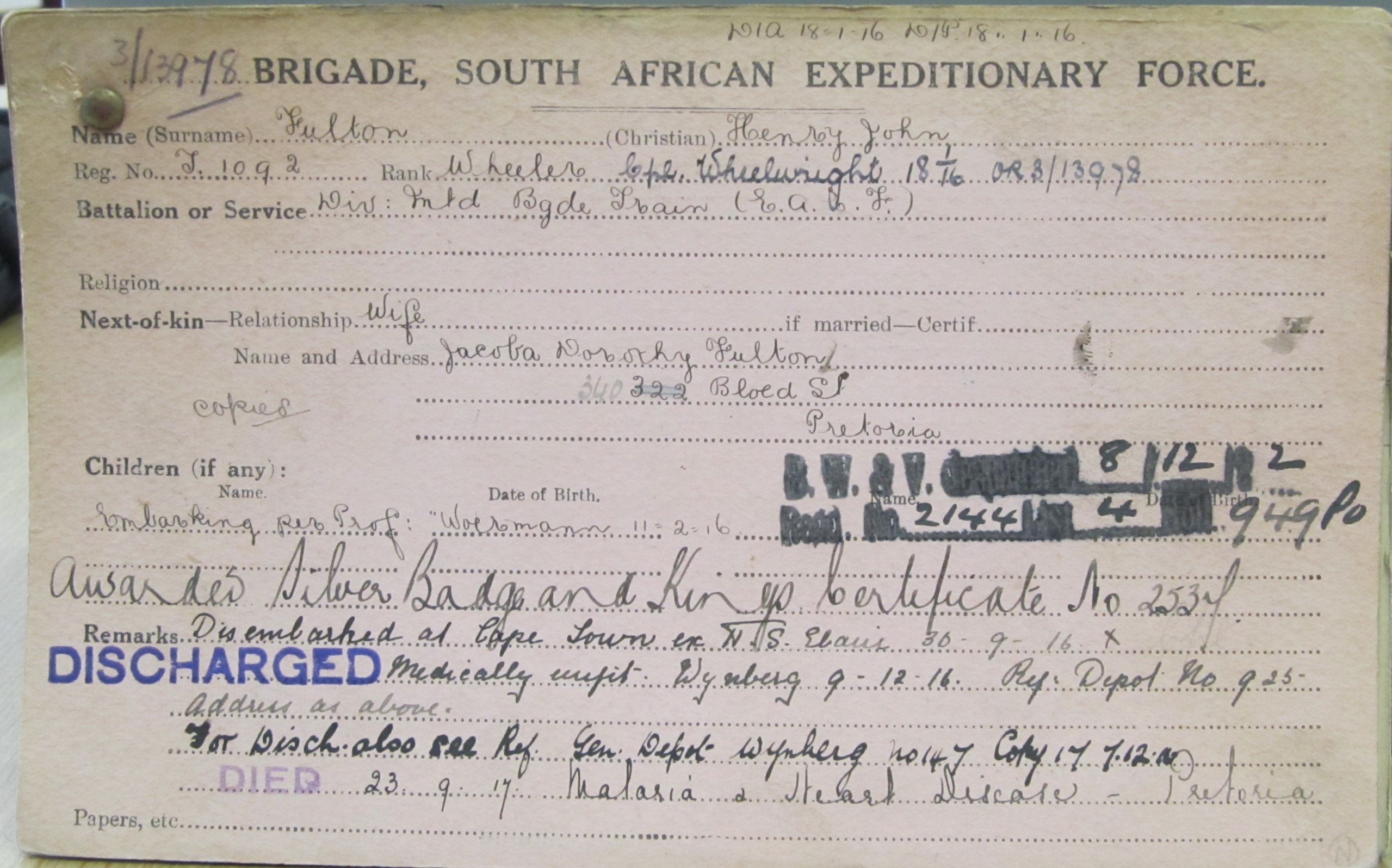 Son of John and Helena Fulton; husband of Jacoba Dorothea Fulton, of 340, Bloed St., Pretoria.