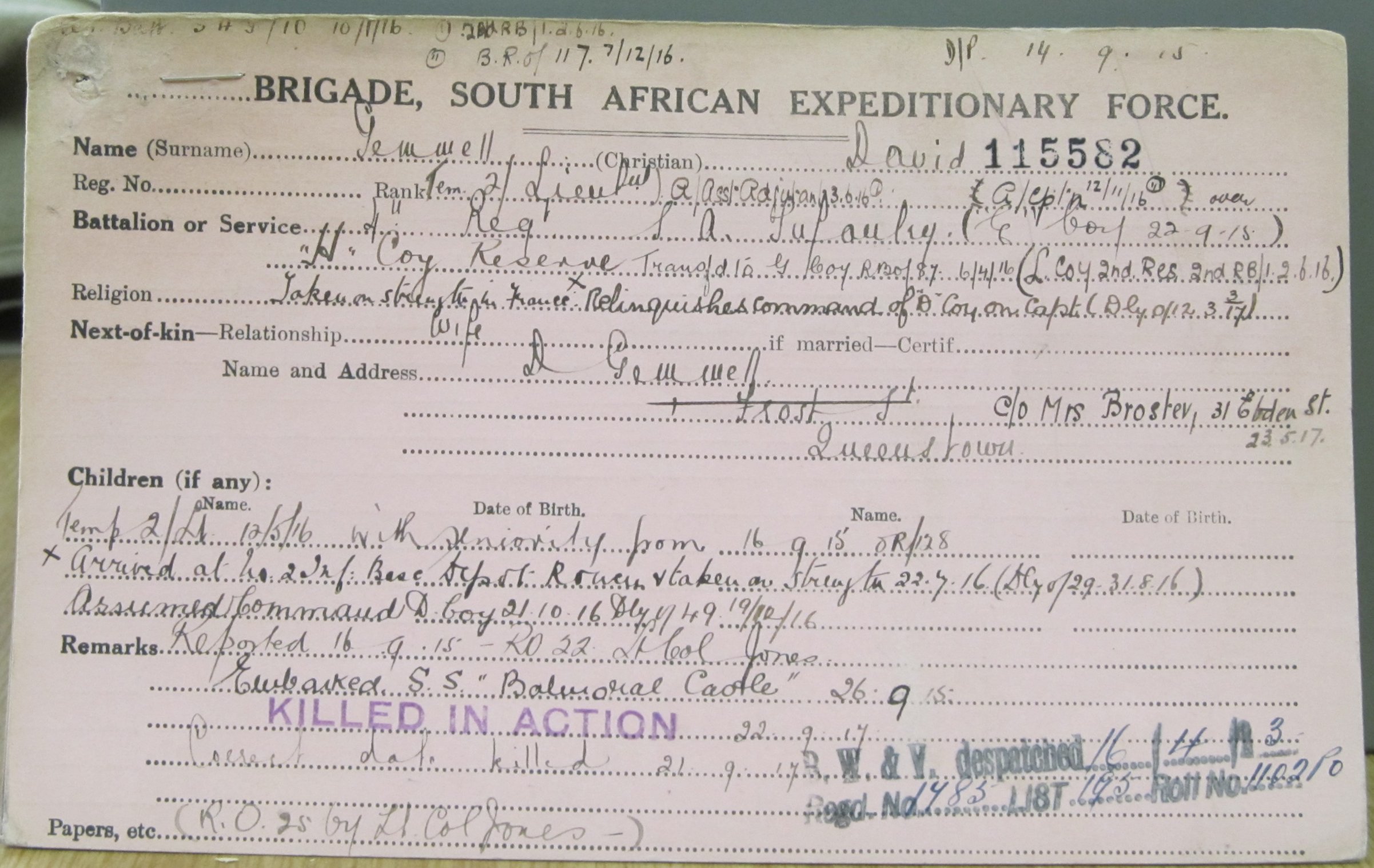 Son of Jane Gemmell (nee Allan), of Lossiemouth, Scotland, and the late David Gemmell, F.E.I.S.; husband of Gwendoline Phyllis Gemmell (nee Broster), of 31, Ebden St., Queenstown, Cape Province. Born Kilmacolm, Renfrewshire, Scotland. A schoolmaster