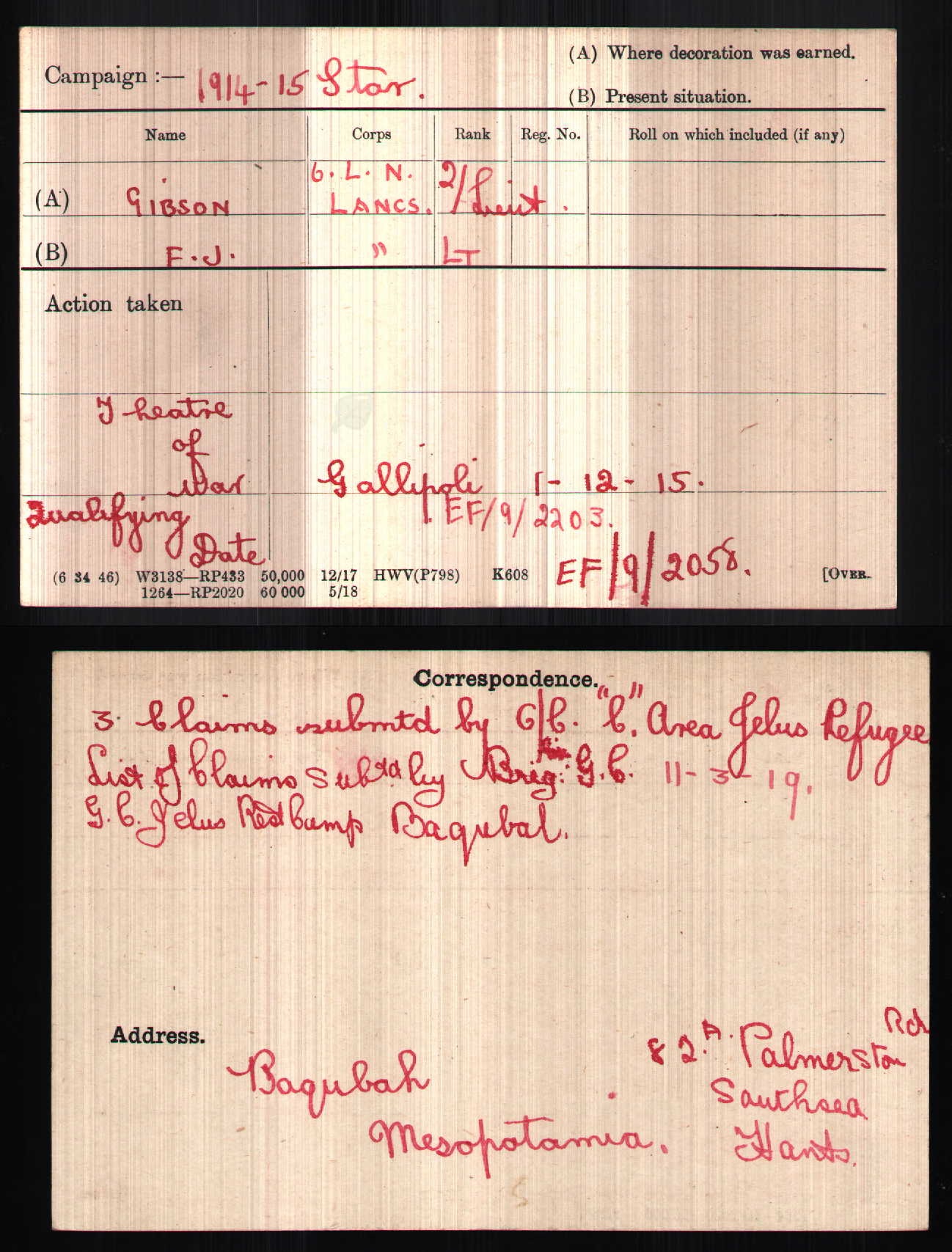 Son of Marguerite Gibson, of "Braefoot", 2, Bruce Rd., Southsea, Portsmouth, and the late Frederick Chapman Gibson. Born Kimberley, South Africa.