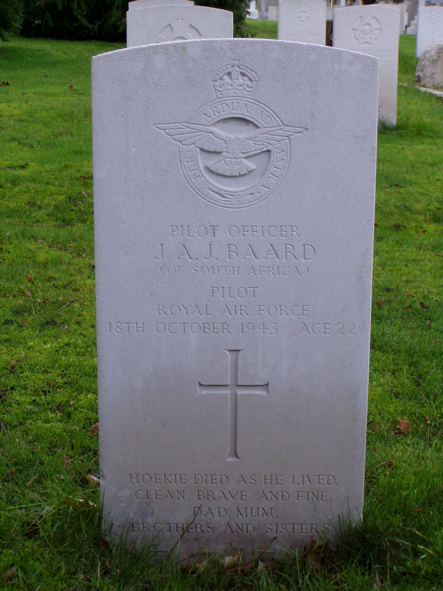 Son of Jacobus Adriaan Johannes Baard and of Huibrecht Gertruida Christina Baard (nee Dippenaar), of Cape Town, South Africa. Born Moorreesburg. Educated Moorreesburg High School; Cadet Draft 1936-7. Jacobus Adriaan Johannes Baard became an apprentice with the Runciman Shipping Company after completing his course on General Botha, obtaining his Second Mate's certificate in 1941. He then joined the RAF and received his training in the USA, Canada and England, obtaining his wings in September 1943 |