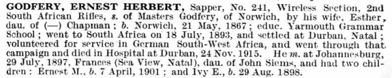 Son of Colonel Masters J. and Esther Godfery, of War Office, York, England. Husband of Frances Elizabeth Godfrey, of La Rochelle, Johannesburg. Born Norwich. An electrician.