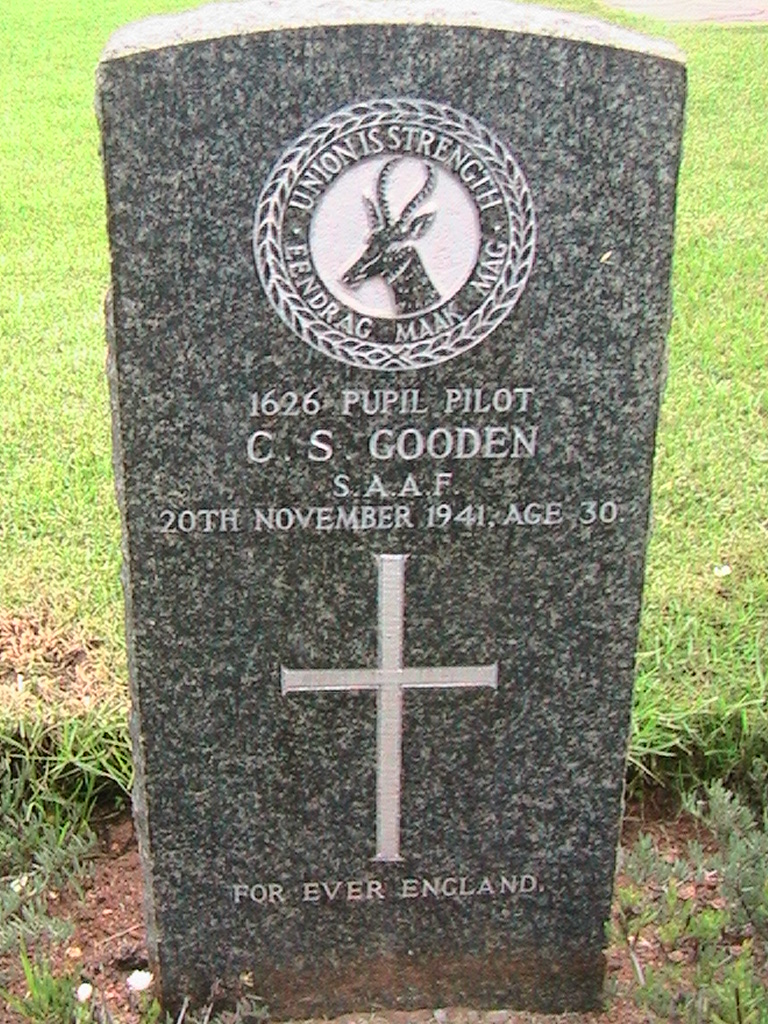Son of Mr. and Mrs. Gilbert Spry Gooden, of Abingdon, Berkshire, England. Husband of Eva Michel (nee Josephson) Gooden, of Parktown North, Johannesburg. Born Shepton Mallet, Somerset. Trained at 23 Air School, Waterkloof, Pretoria. Commemorated on Greytown, KZN WWII Memorial