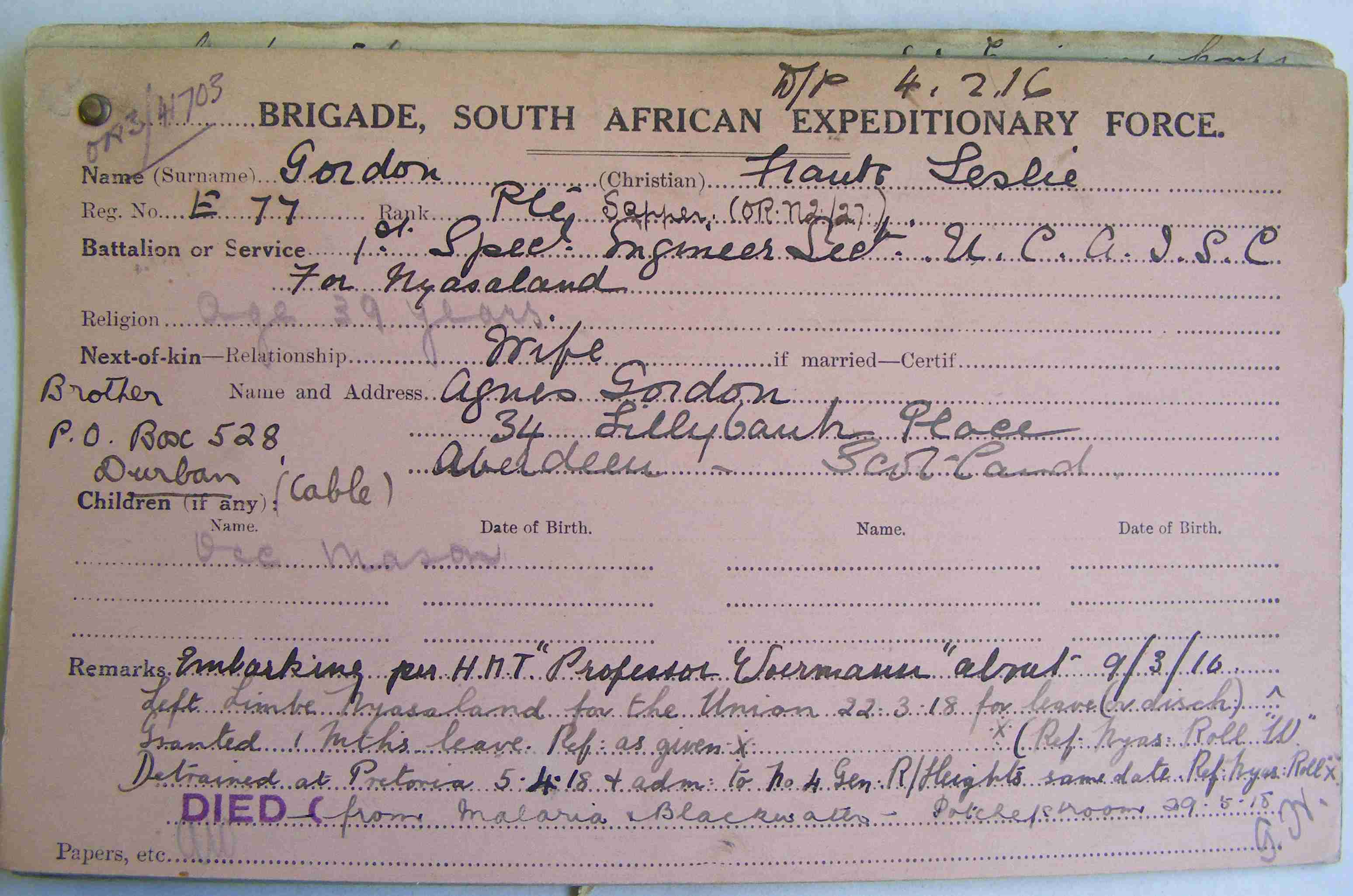 Son of Charles Gordon, of Aberdeen; husband of Agnes Middleton Gordon, of 32, Lilybank Place, Aberdeen, Scotland.