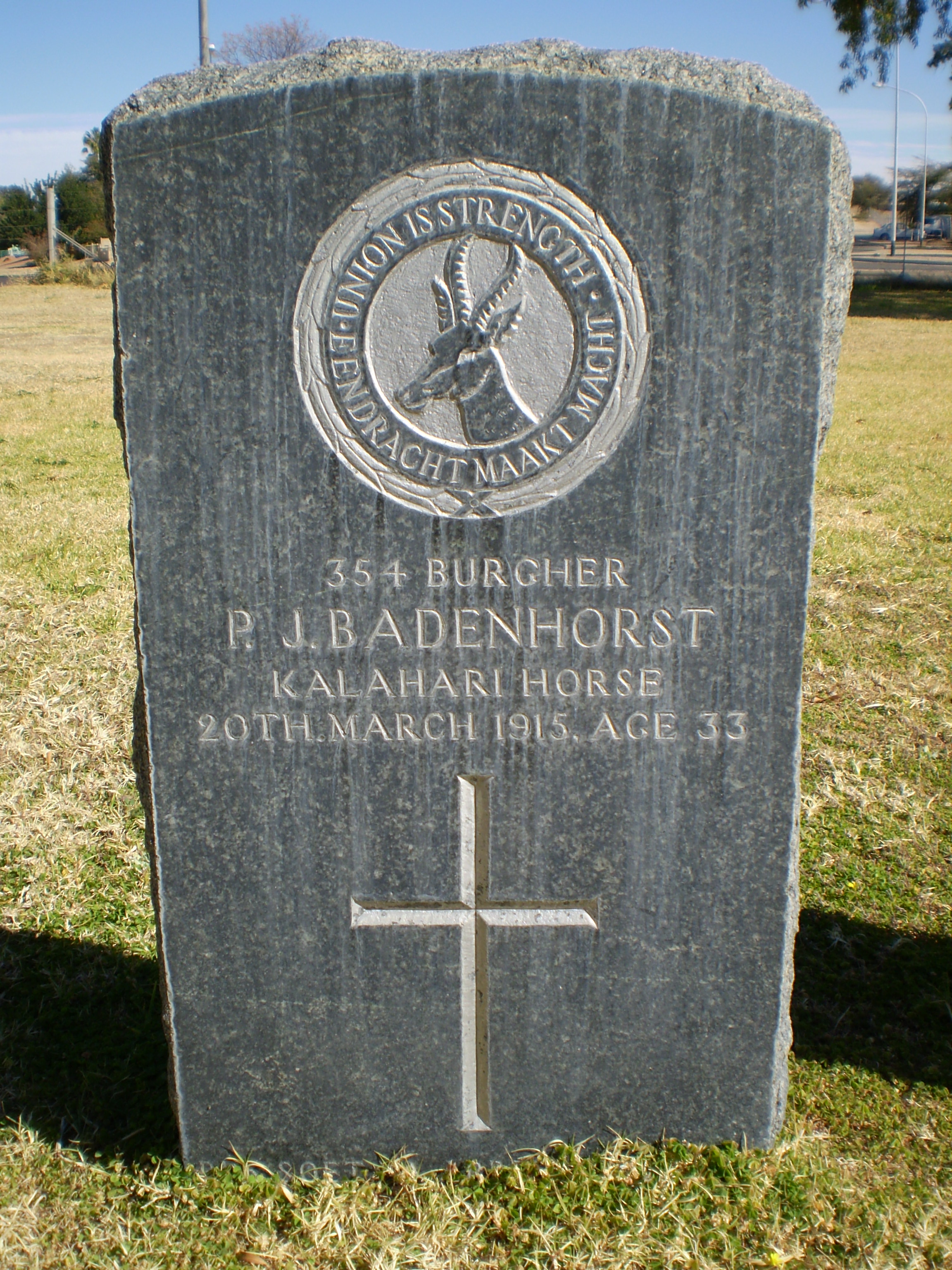 Son of Petrus Johannes Badenhorst and Sophia Badenhorst, of Britstown; husband of Martha M. J. Loats (formerly Badenhorst), of Verwater, Deben, Cape Province.