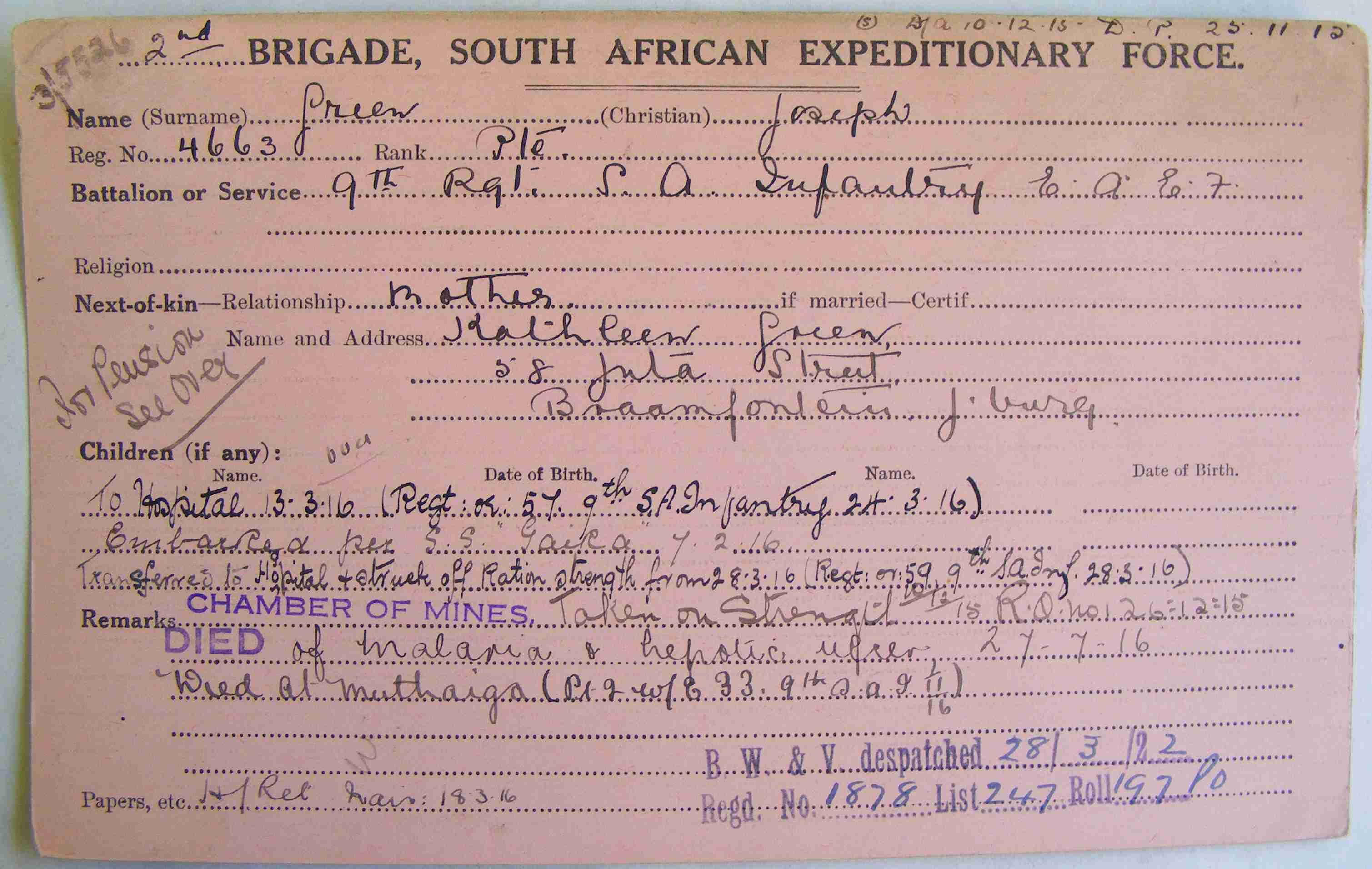 Son of Mr. H. A. Green, of 125, Eendracht St., Braamfontein, Johannesburg.