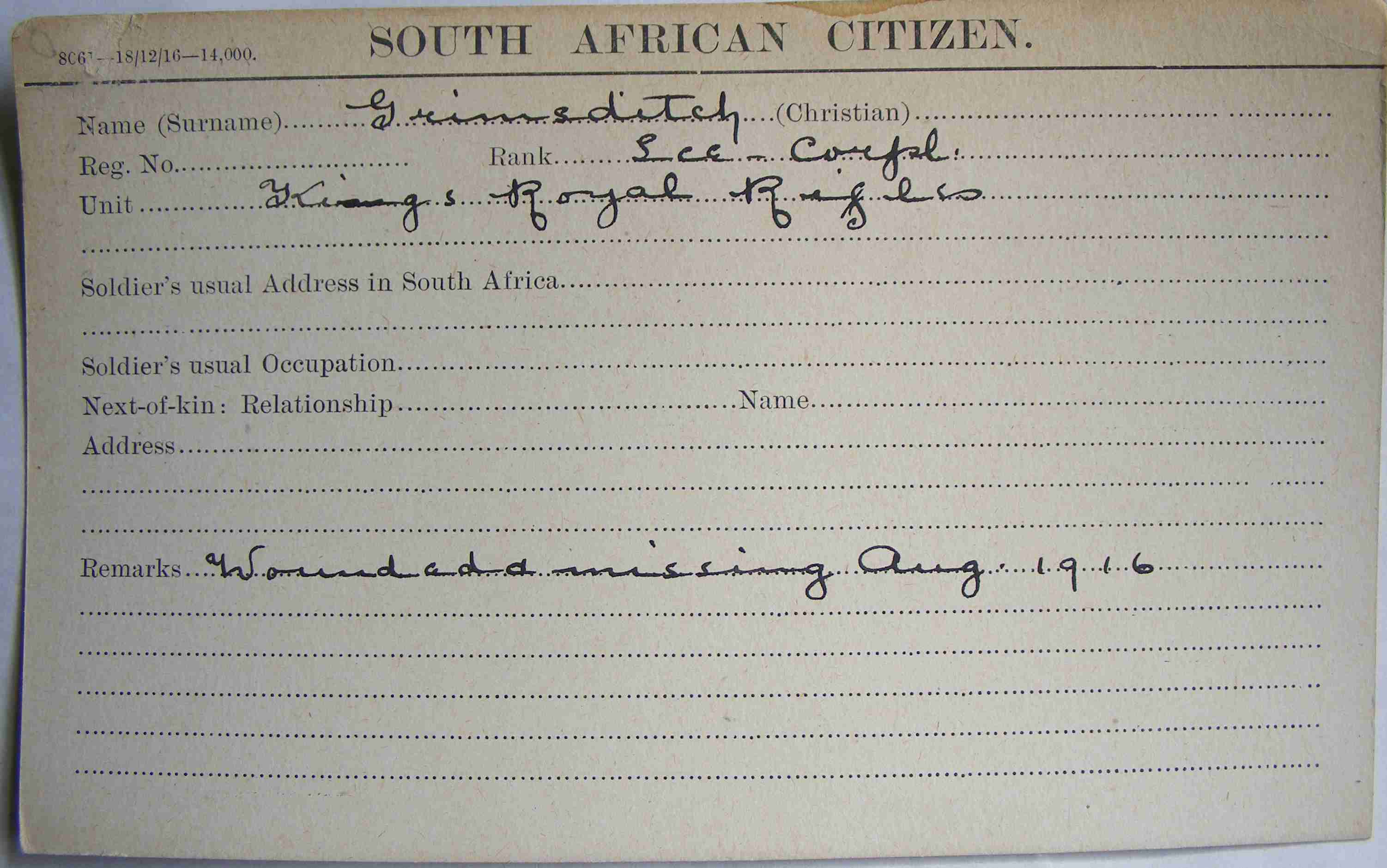 Son of Alfred Henry and Edith Margaret Grimsditch, of 1, Stanmore Road, Wavertree, Liverpool. A trader. ref. South African Roll of Honour 1914-1918