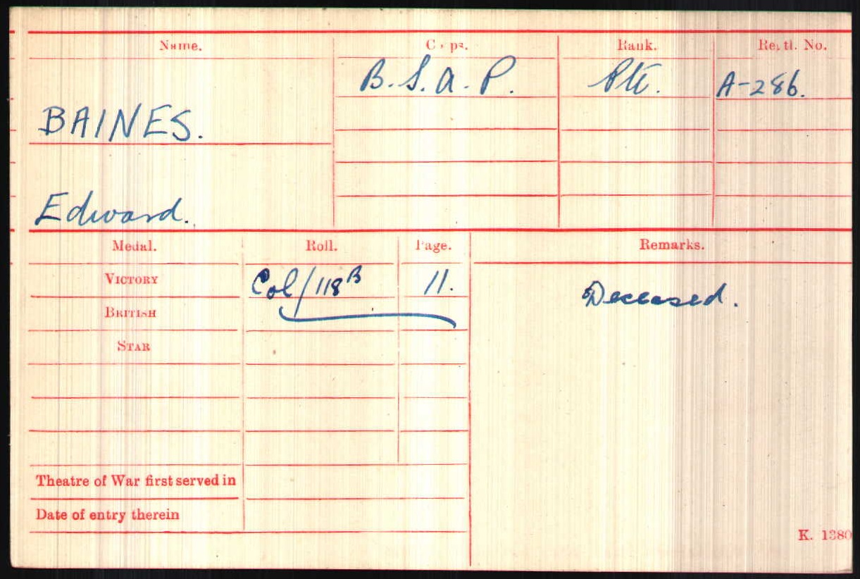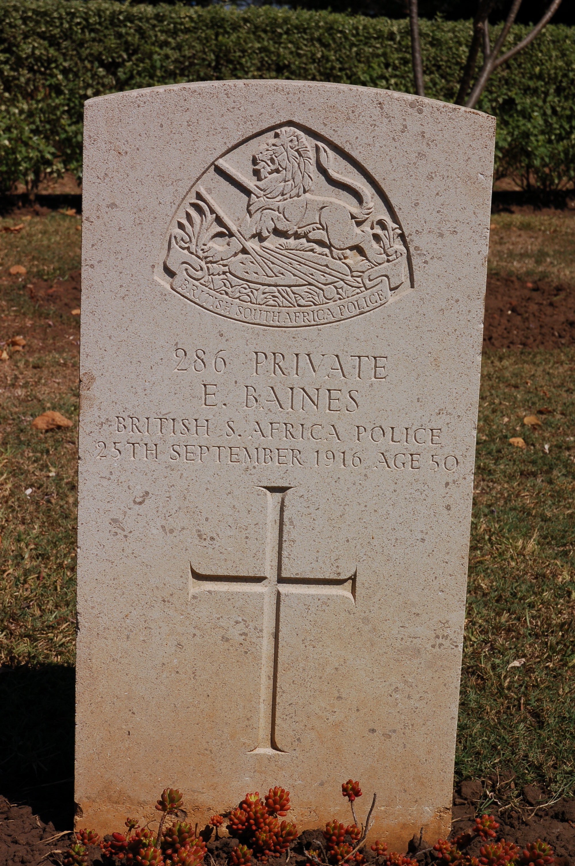 Son of Edward T. Baines. Joined the British South Africa Police as a Trooper No. 86 on the 26th May 1899 and was discharged at his own request on 8th December 1908. He was a late volunteer as Private No. A 286 for the BSA Police Infantry Company, formed in Southern Rhodesia, for duties on the North Eastern Border of Northern Rhodesia