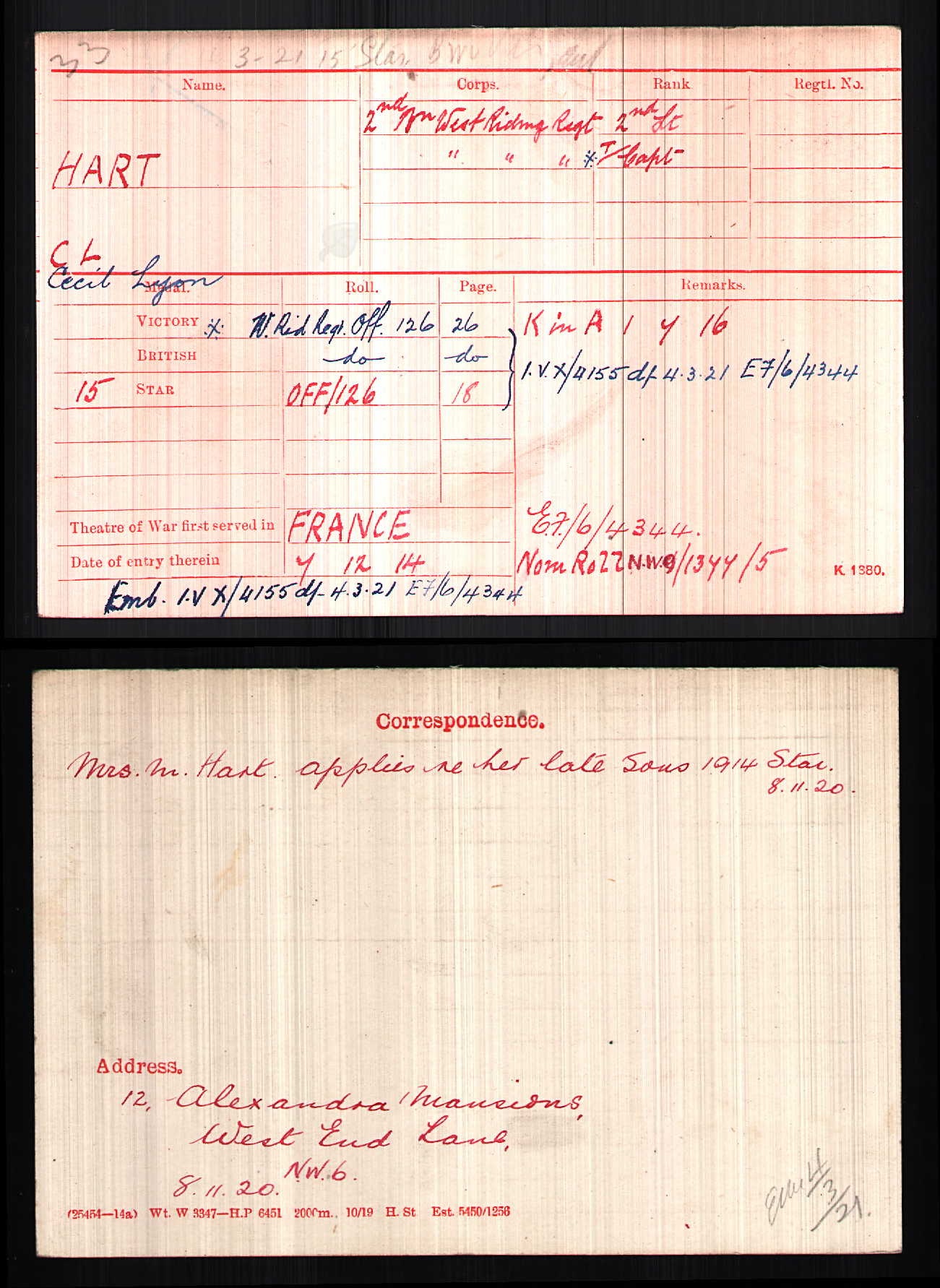 Son of Moss Alexander and Marguerite Hart, of 12 Alexandra Mansions, of West End Lane, NW6. Born Kimberley. ref. South African Roll of Honour 1914-1918 ***Jewish.