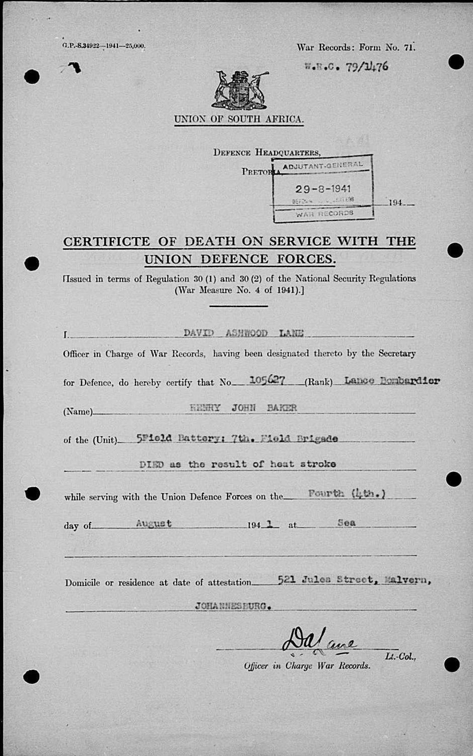 Son of Mr. and Mrs. H. J. Baker; husband of Edith Victorina Baker, of Johannesburg, Transvaal, South Africa. Born Kent, England. A winding engine driver with E.R.P.M.